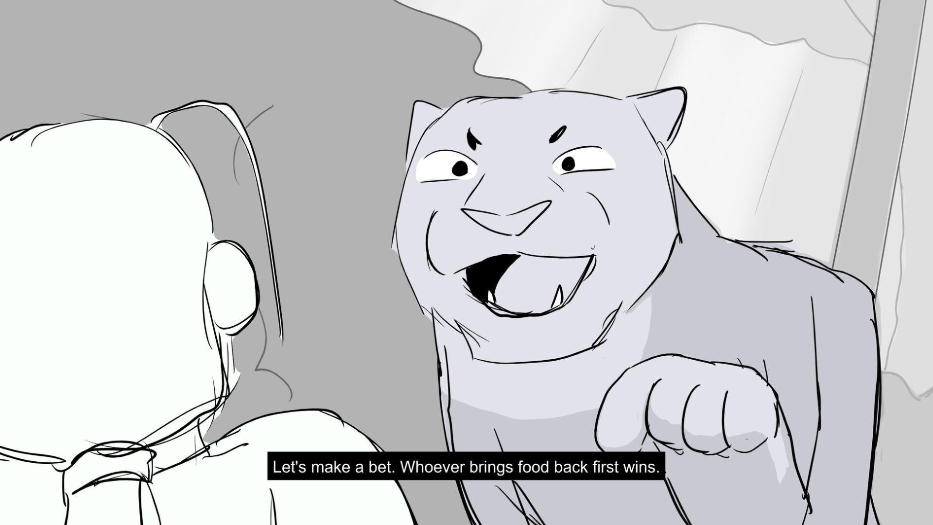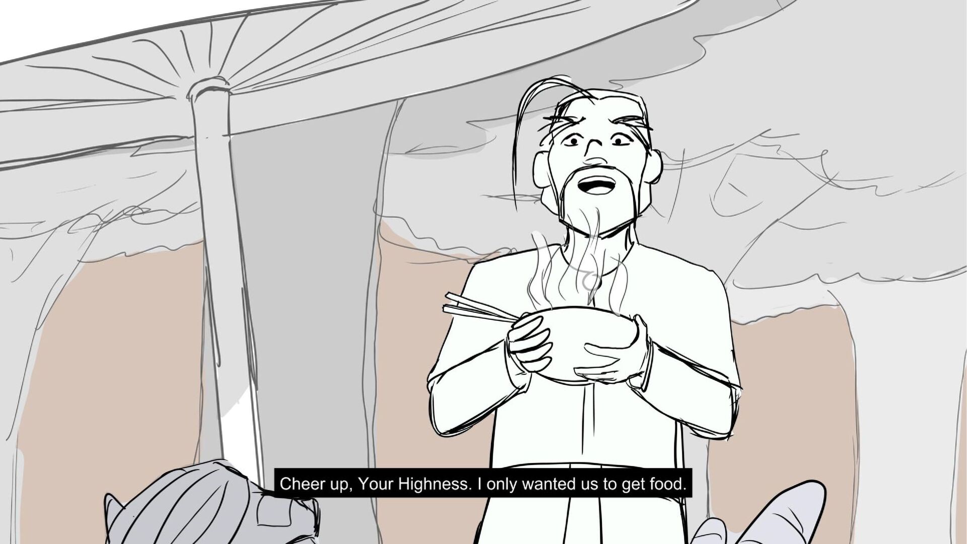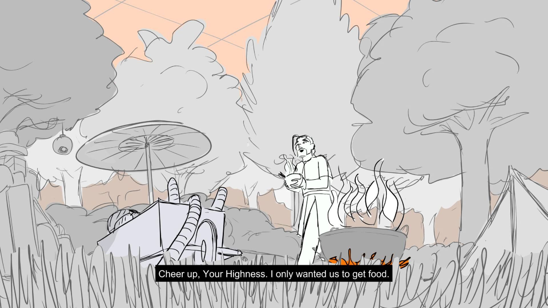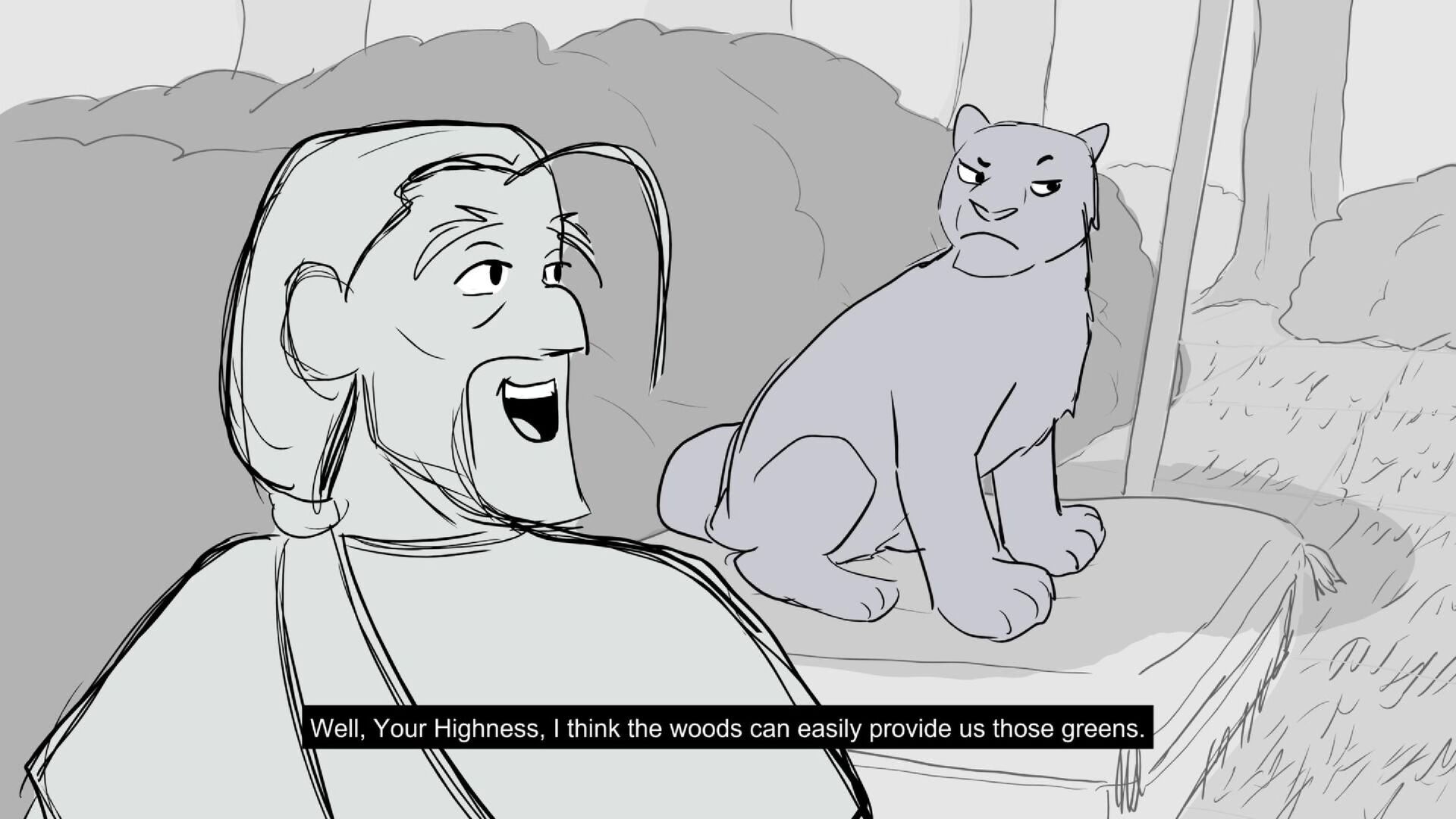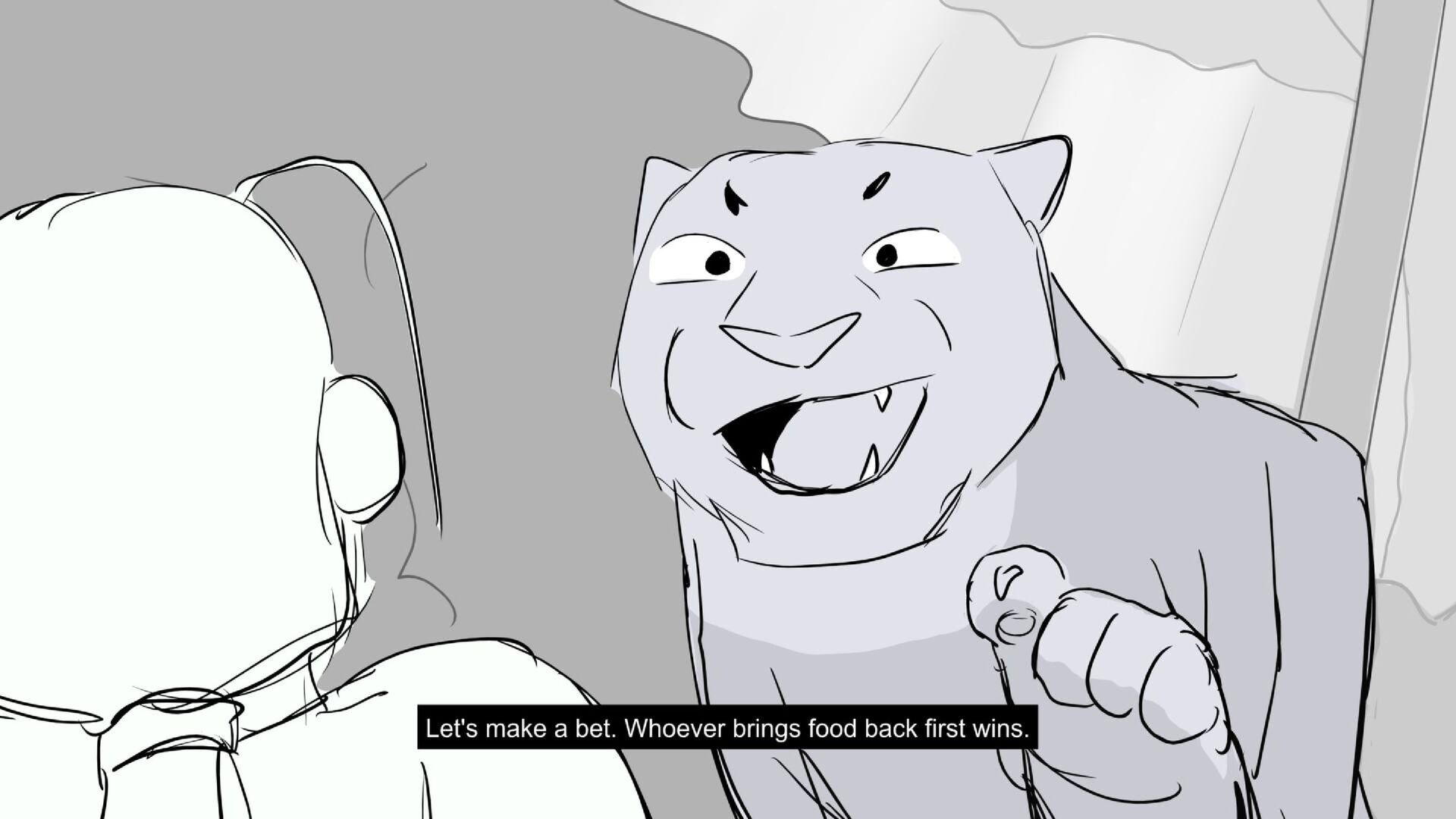 A cursed prince and his tutor are on a journey to undo said curse. Along the way, they ran out of food, so the prince made a bet on how to obtain food. His method of winning the bet hit upon a series of mishaps.
