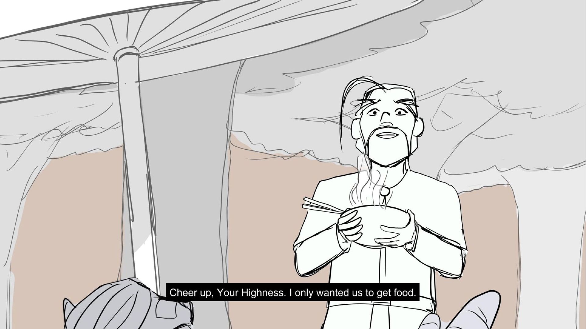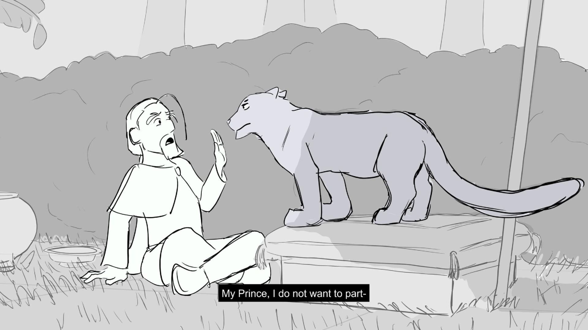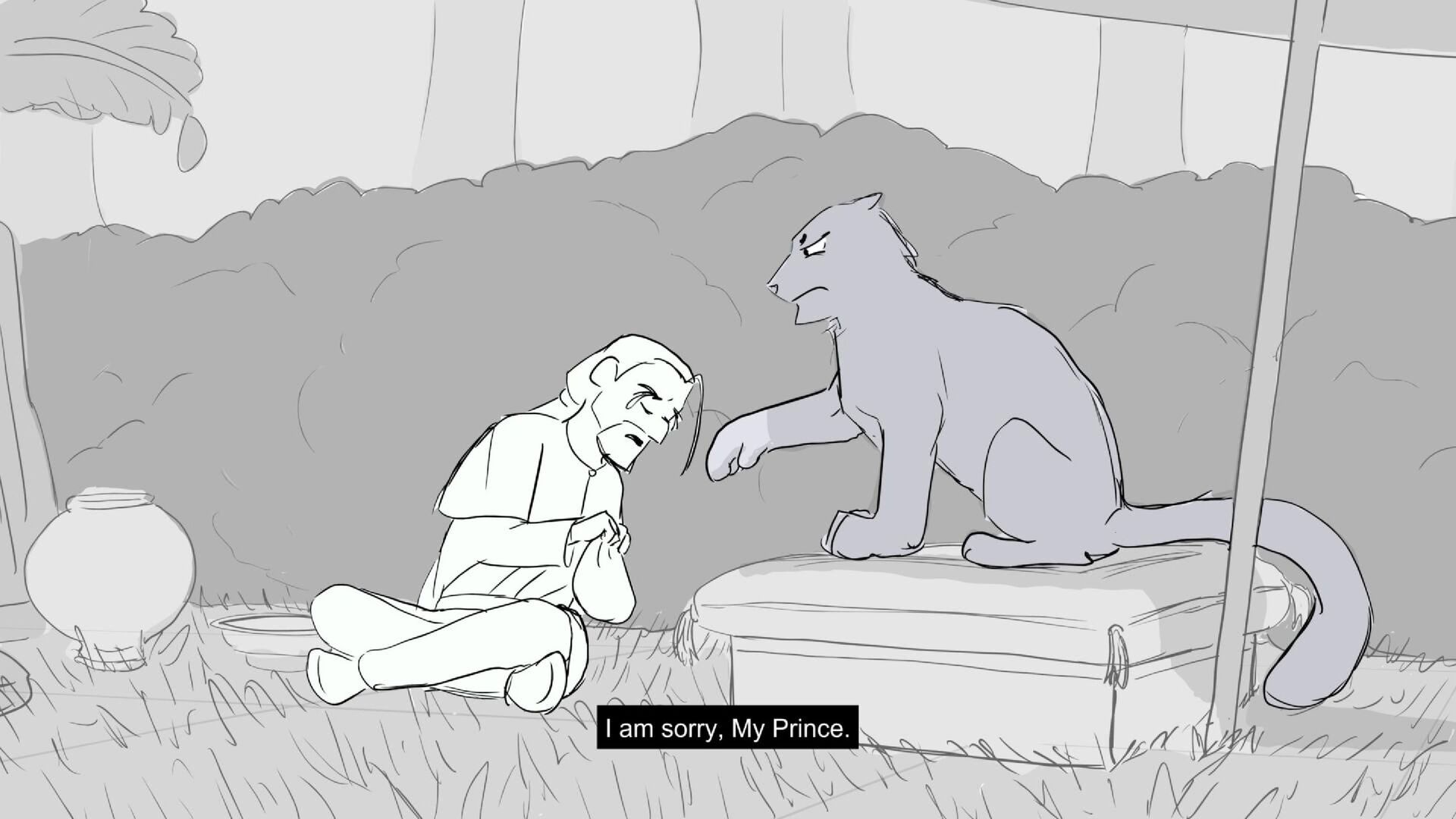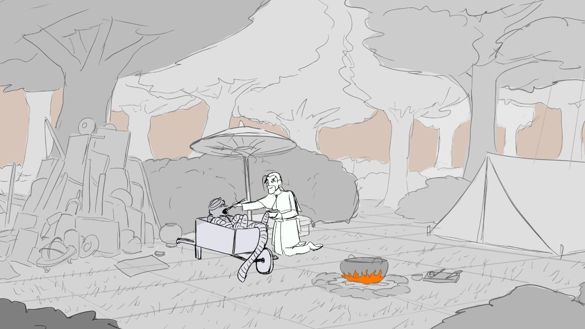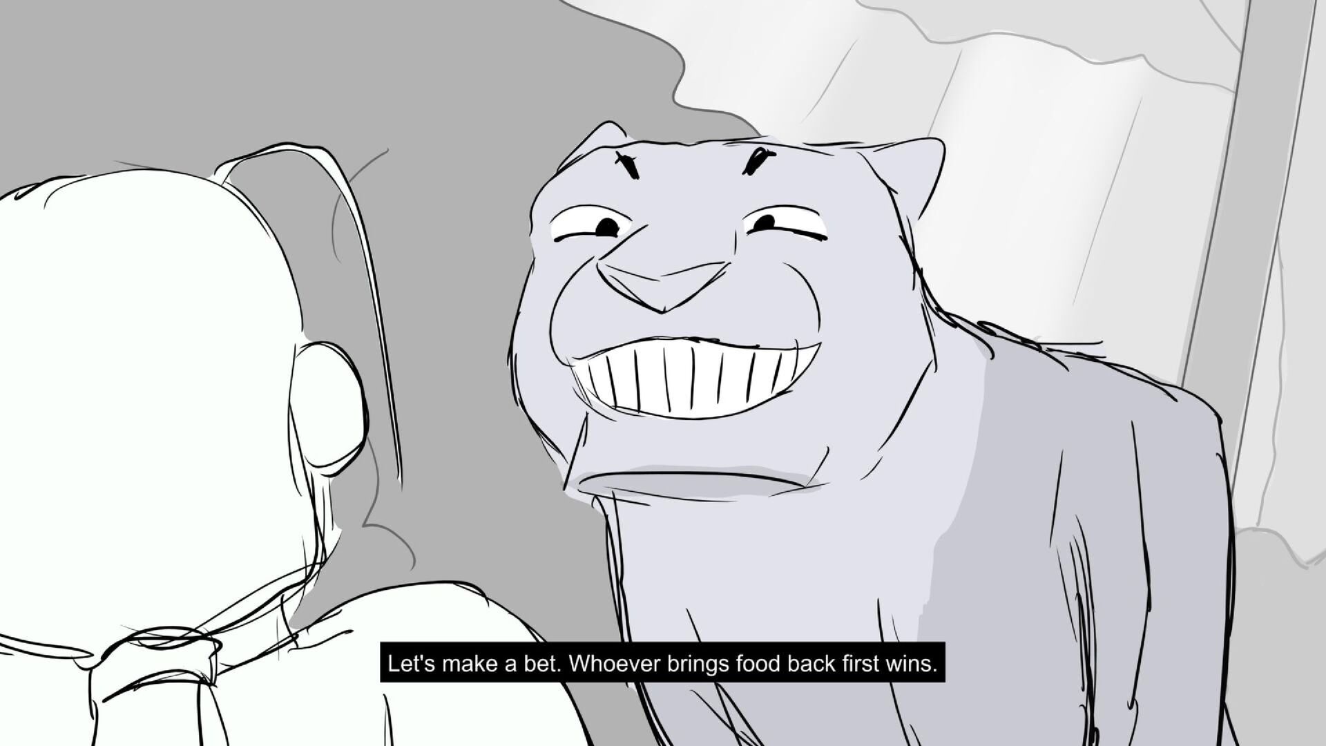 A cursed prince and his tutor are on a journey to undo said curse. Along the way, they ran out of food, so the prince made a bet on how to obtain food. His method of winning the bet hit upon a series of mishaps.