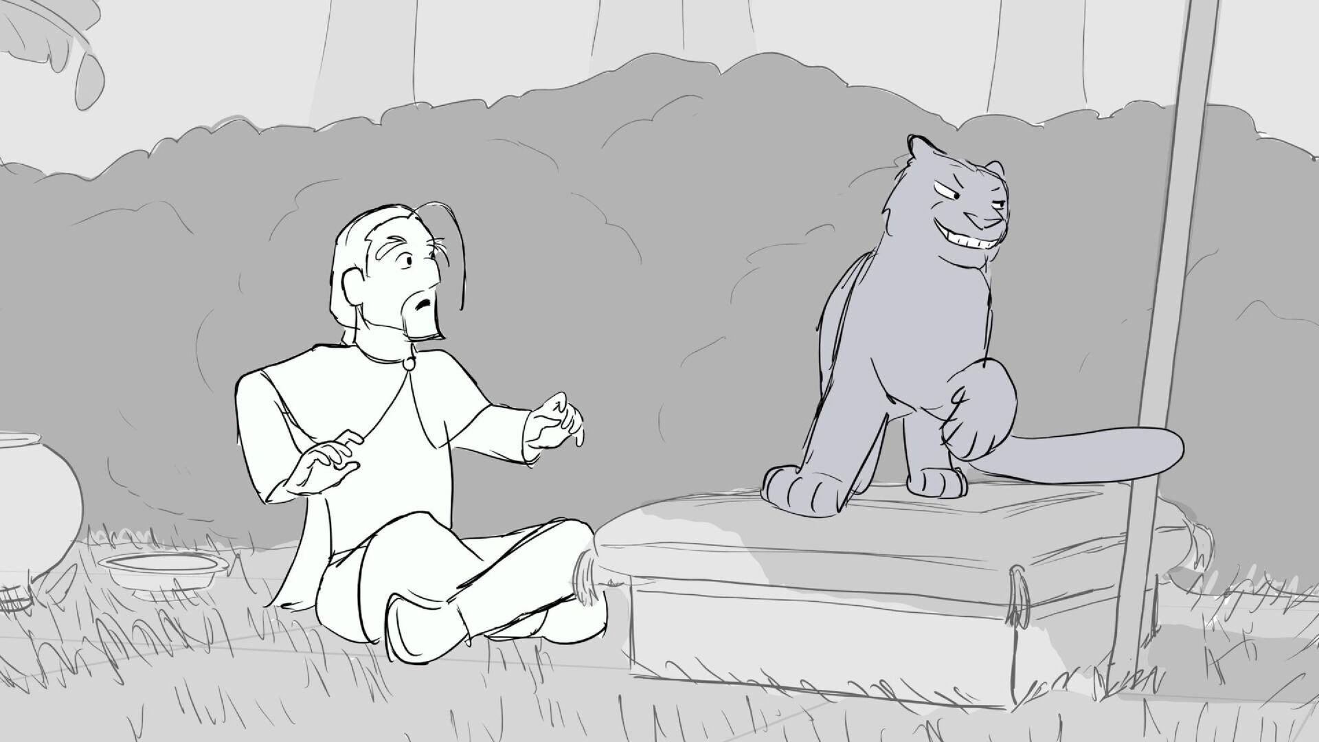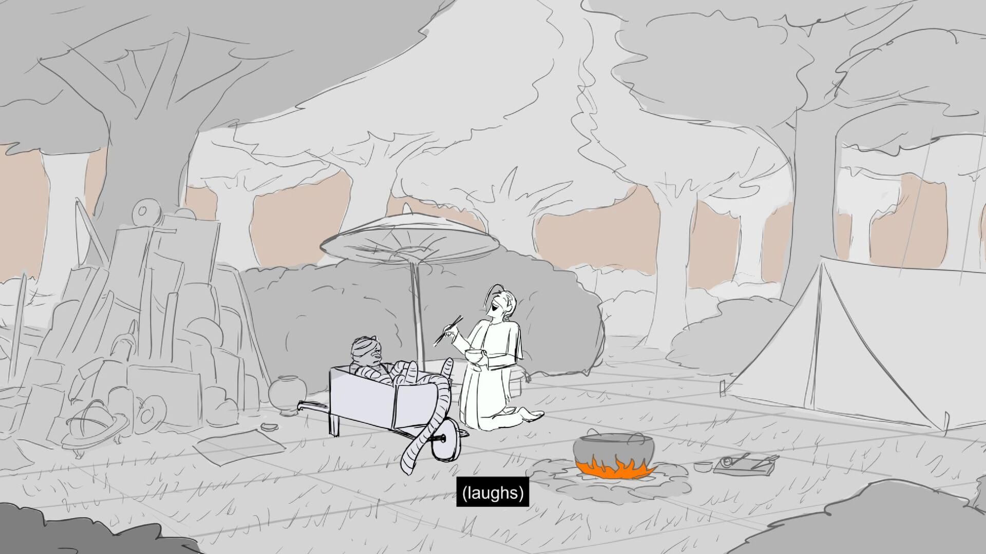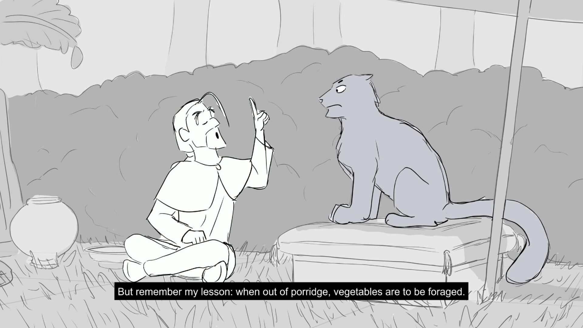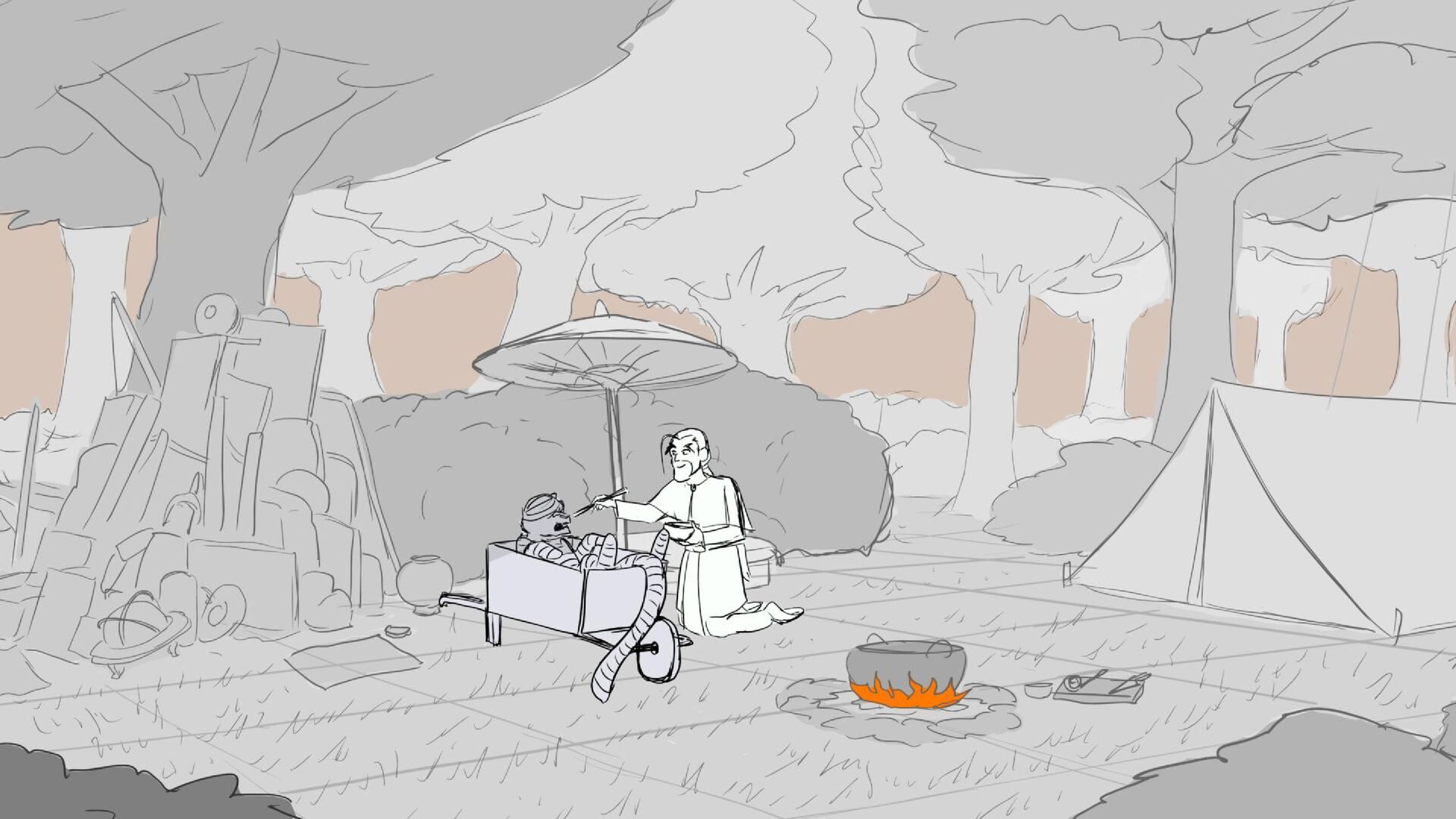 A cursed prince and his tutor are on a journey to undo said curse. Along the way, they ran out of food, so the prince made a bet on how to obtain food. His method of winning the bet hit upon a series of mishaps.