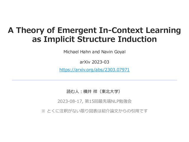 𝒪(𝑅! + 𝐷 τ" ) で押さえられる 論⽂で正確なステートメントを確認したいかた向けの設定メモ︓ • 気になっている「関係データ」 − 合計 𝑛 種の「関係データ」 𝑥! , 𝜑 𝑥! ! − 例︓{(country, capital of it)} = {(France, Paris), ...} • LM への⼊⼒ … ⽂脈内学習のプロンプト︔0 〜 𝑛 − 1 ショット − 𝑃" ≔ − 例︓ • LM からの出⼒ − . − 例︓ ICTの 不正解率は 当該関係を表す 部分⽊が⼩さいときに, ⼩さくなる 反復の複雑性が低く=コーパスで 当該関係の繰り返しが起きやすく,