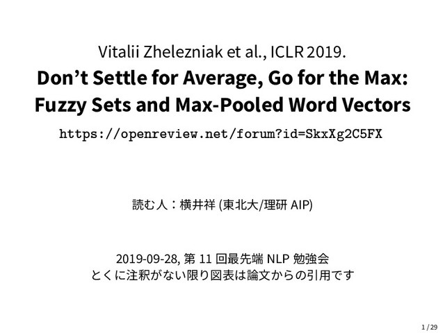 Go for the Max: Fuzzy Sets and Max-Pooled Word Vectors https://openreview.net/forum?id=SkxXg2C5FX 読む人:横井祥 (東北大/理研 AIP) 2019-09-28, 第 11 回最先端 NLP 勉強会 とくに注釈がない限り図表は論文からの引用です 1 / 29