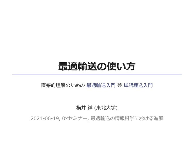 自然言語処理を中心に多くの利用例を挙げながら、最適輸送の直感的な理解を目指すスライドです。