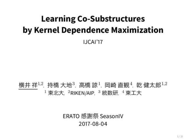 y) ͷؔ࿈ͷྑ͞ • x = xi ∧ y = yi ͳΔ (xi , yi ) ͕ଘࡏ → PMI ্͕ঢ • x = xi ⊻ y = yi ͳΔ (xi , yi ) ͕ଘࡏ → PMI ͕Լ PHSIC ͰଌΔ (x, y) ͷؔ࿈ͷྑ͞ • ˜ k(x, xi )˜ ℓ(y, yi ) > 0 ͳΔ (xi , yi ) ͕ଘࡏ → PHSIC ্͕ঢ ɹ “x ≈ xi ∧ y ≈ yi” ͷͱ্͖ঢ • ˜ k(x, xi )˜ ℓ(y, yi ) < 0 ͳΔ (xi , yi ) ͕ଘࡏ → PHSIC ͕Լ PMI:MI ≈ PHSIC:HSIC MI(X,Y; Z) = 1 N ∑ i PMI(xi , yi; Z) HSIC(X,Y; Z) = 1 N ∑ i PHSIC(xi , yi; Z) 28 / 31