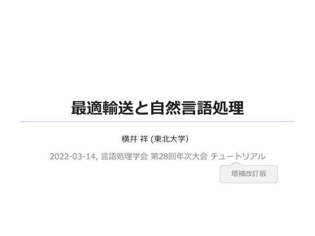 − コスト 𝑪!" = 𝑐(𝒙!, 𝒚") が 点間の距離 となっているとき, 最適輸送コストは 確率分布 (点群) 間の距離 を定める 𝑊 𝒂, 𝒃; 𝑪 ≔ min 𝑷∈𝑼 𝒂,𝒃 = % = & 𝑐(𝒙% , 𝒚& ) 𝑷%& 𝑊(𝒂, 𝒃) 𝑊(𝒂, 𝒛) 𝑊(𝒃, 𝒛) • ∀𝒂, 𝒃. 𝑊(𝒂, 𝒃) = 0 ⇔ 𝒂 = 𝒃 • ∀𝒂, 𝒃. 𝑊 𝒂, 𝒃 = 𝑊 𝒃, 𝒂 • ∀𝒂, 𝒃, 𝒛. 𝑊 𝒂, 𝒃 + 𝑊 𝒃, 𝒛 ≥ 𝑊(𝒂, 𝒛) 最適輸送コストを確率分布間の距離尺度として ⽤いることができる • ∀𝒙, 𝒚. 𝑐 𝒙, 𝒚 = 0 ⇔ 𝒙 = 𝒚 • ∀𝒙, 𝒚. 𝑐 𝒙, 𝒚 = 𝑐 𝒚, 𝒙 • ∀𝒙, 𝒚, 𝒛. 𝑐 𝒙, 𝒚 + 𝑐 𝒚, 𝒛 ≥ 𝑐(𝒙, 𝒛) ⼀般に最適輸送の計算に⽤いるコストは 距離でなくて良い