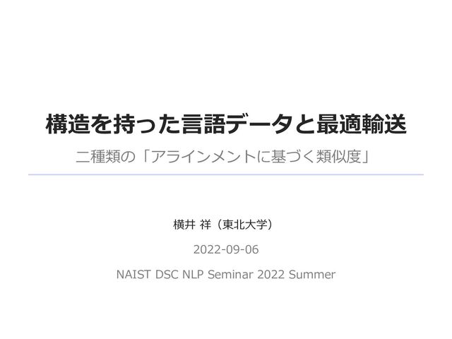 − 「全体として類似 = 部分がよくアラインメントできる」という考え⽅ に基づく⼿法と捉えることができる • ⾃然⾔語処理 − 単語=⽂字列,コーパス=⽂集合のような再帰的な構造を持つ − 「全体として類似 = 部分がよくアラインメントできる」という考え⽅ がしばしば⽤いられる • 最適輸送 for ⾃然⾔語処理 − 相性よし︕