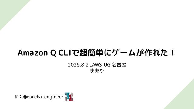 𝕏:@eureka_engineer Amazon Q CLIで超簡単にゲームが作れた! 2025.8.2 JAWS-UG 名古屋 まあり