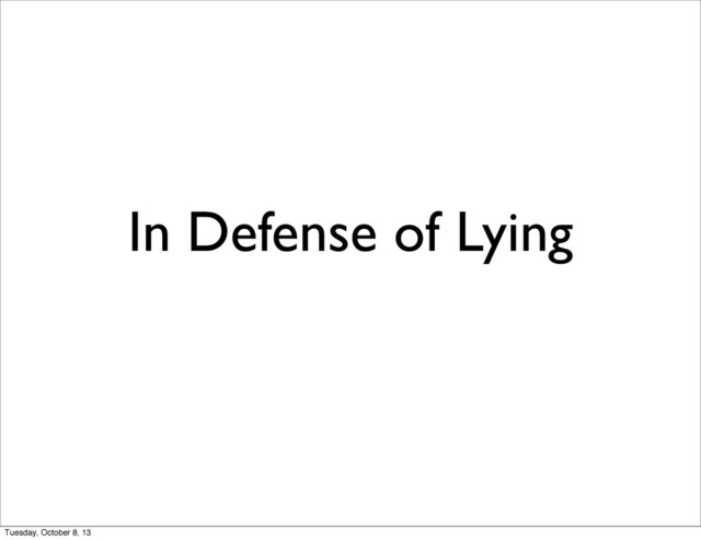 B (truth): “Fine, I guess. We went to dinner. He’s nice enough, but no real chemistry.” Person B (lie): “It was all going well enough, but then he started spontaneously bleeding from both ears. I said we should go to the ER, but he said it happened all the time, and just please ignore it. So, all night long, everyone kept coming up to us and trying to see if they could call 911, and he kept saying he was fine. Eventually, he got really angry and curled up in a ball on the floor and started screaming. The movie theater manager called the authorities, and they strapped him to a gurney and took him away. Also, he apparently owns a tiger.” Tuesday, October 8, 13