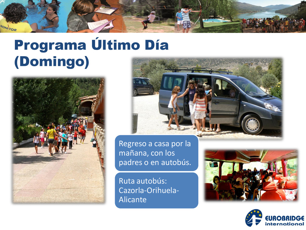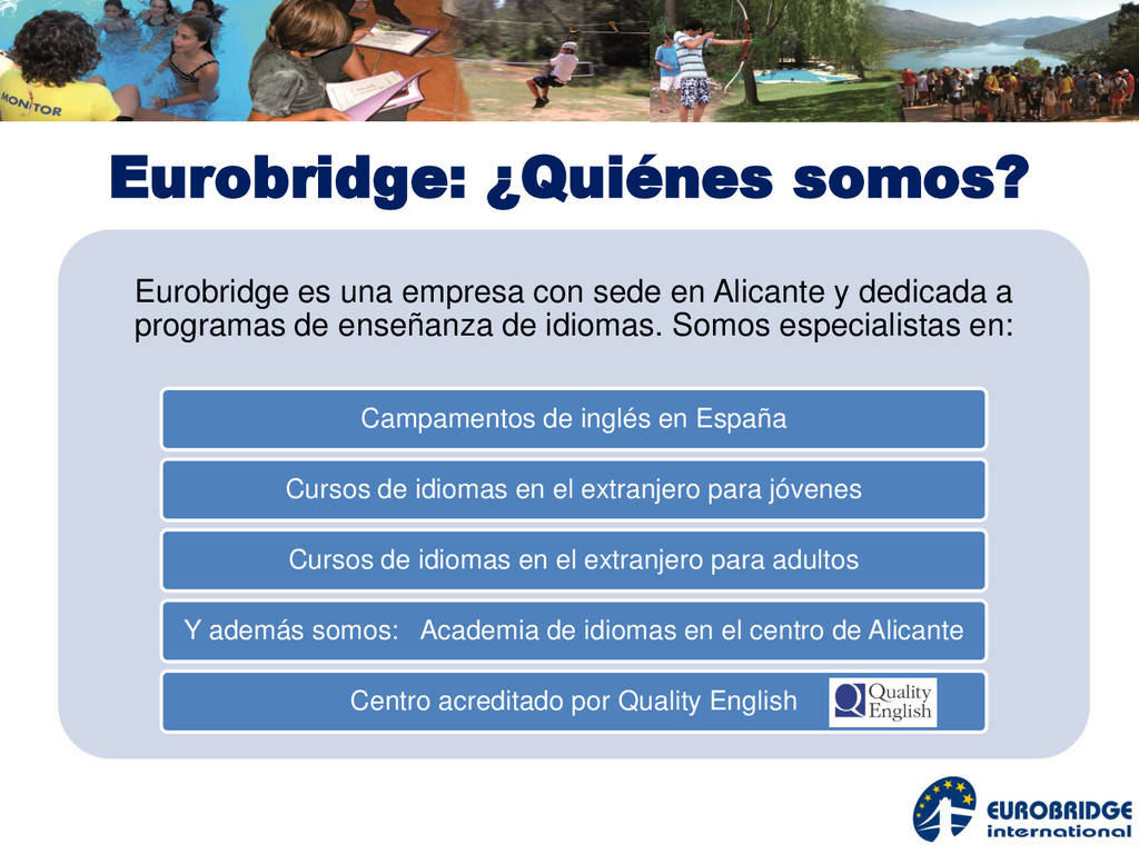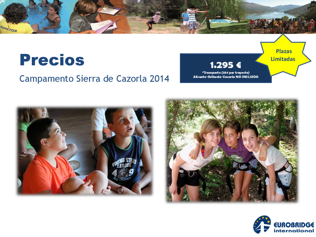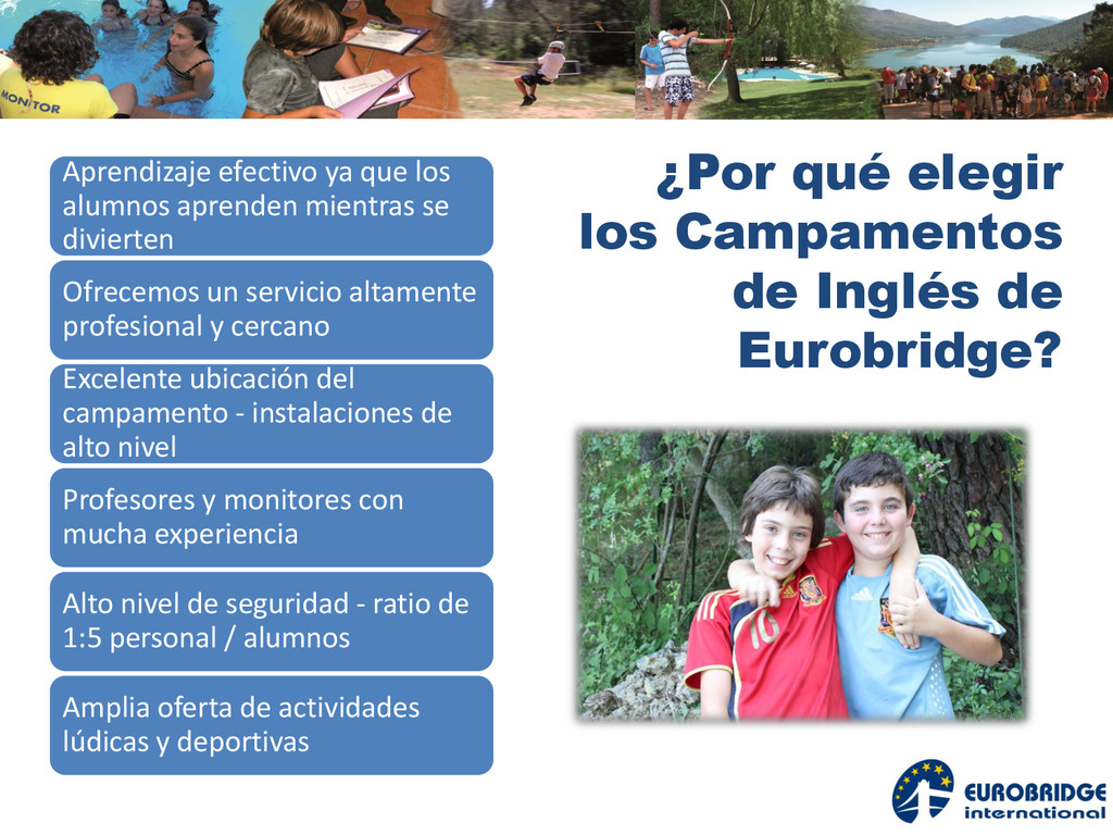 nivel de los participantes Estudio temático de: plantas, animales, ecología, actividades, juegos, prensa, etc. Relacionadas con las actividades: práctica del idioma durante todo el día Dinámicas y divertidas Enfocadas en la expresión oral y comprensión auditiva Clases de Inglés