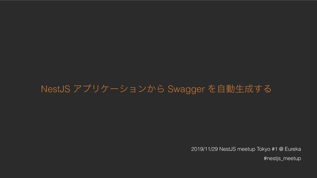 = await NestFactory.create(AppModule); const options = new DocumentBuilder().build(); const document = SwaggerModule.createDocument(app, options); SwaggerModule.setup('api', app, document); return app; } export async function bootstrap(): Promise<void> { const app = await createSwaggerApp(); await app.listen(8081); } bootstrap(); /api でドキュメントページへ /api-json で swaggewr json 吐き出し