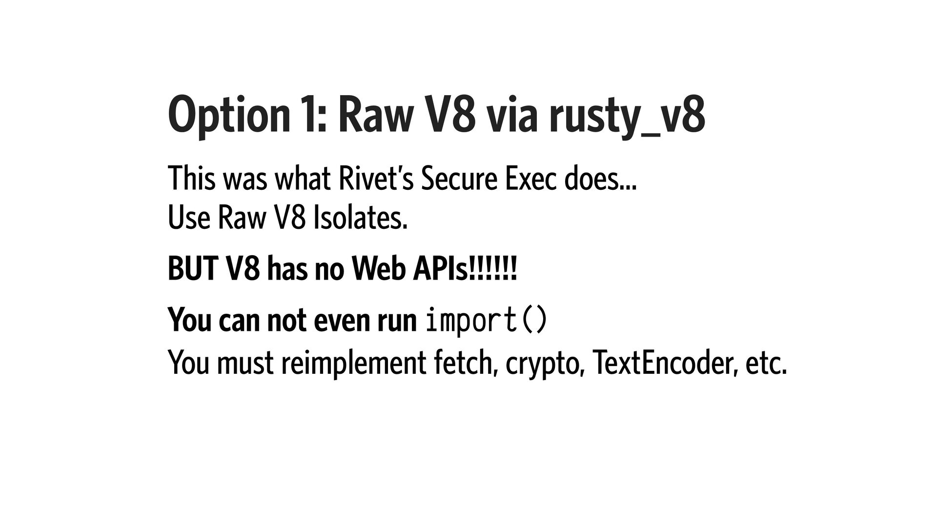 Secure Exec does… Use Raw V8 Isolates. BUT V8 has no Web APIs!!!!!! You can not even run import() You must reimplement fetch, crypto, TextEncoder, etc.