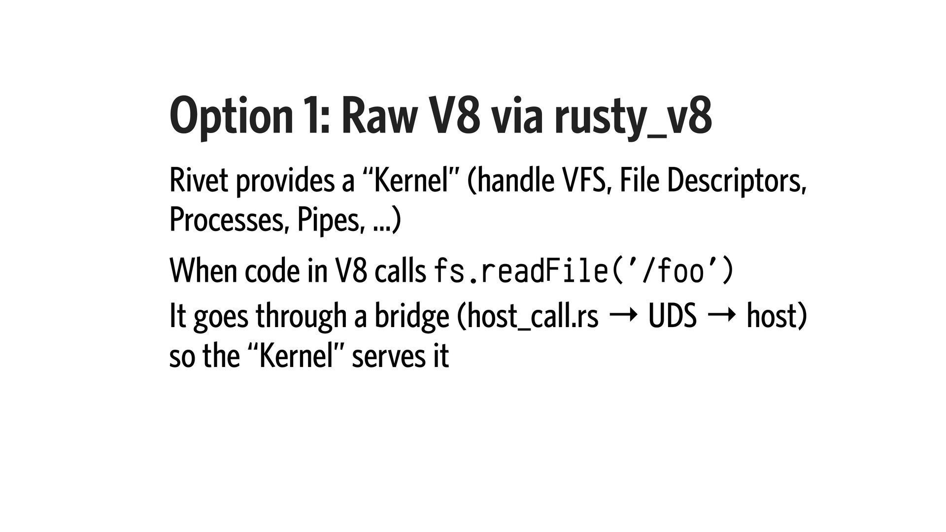 (handle VFS, File Descriptors, Processes, Pipes, …) When code in V8 calls fs.readFile('/foo') It goes through a bridge (host_call.rs → UDS → host) so the “Kernel” serves it