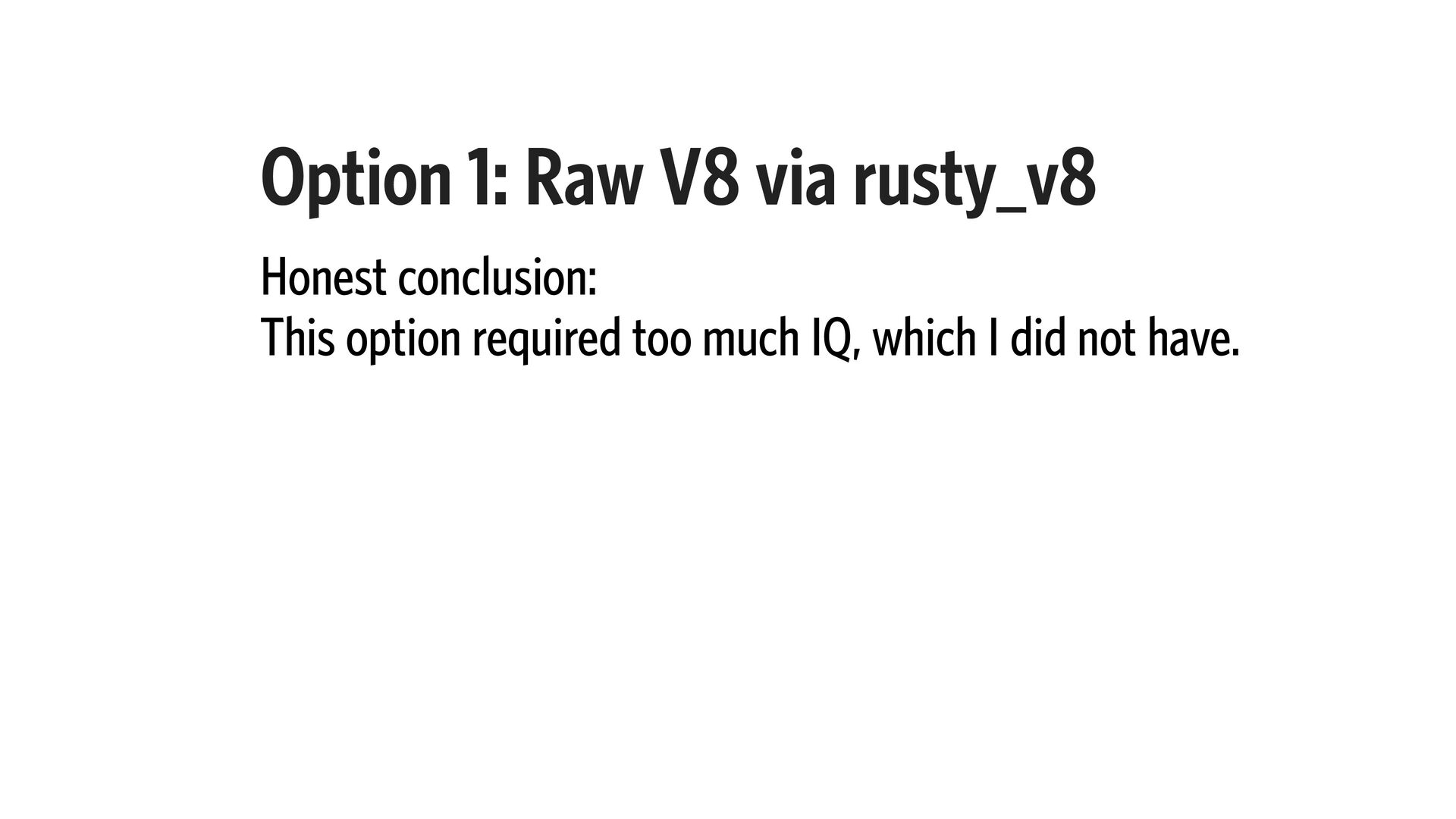 8. Option 1: Raw V8 via rusty_v8 Honest conclusion: This option