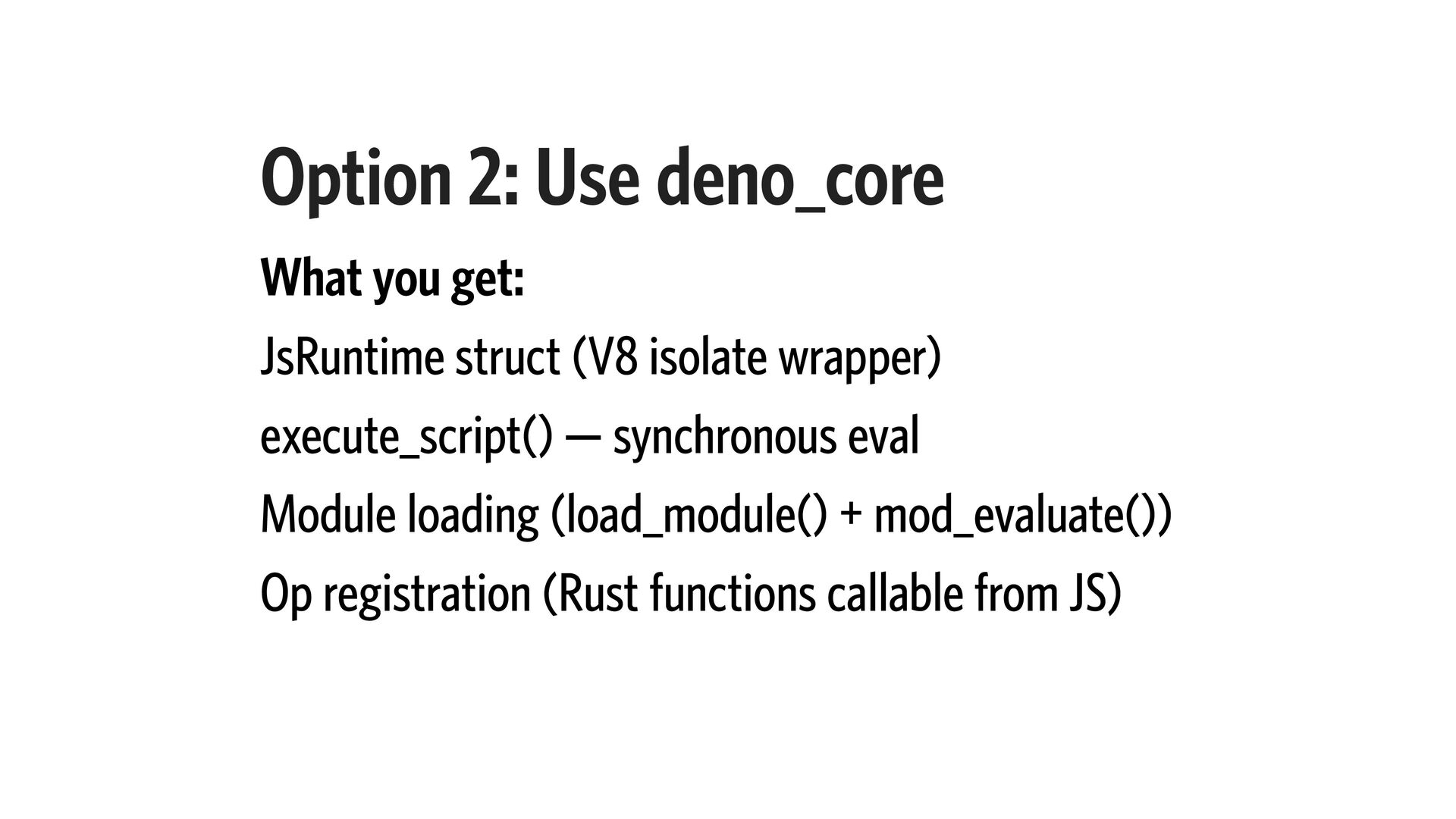 9. Option 2: Use deno_core What you get: JsRuntime struct (V8
