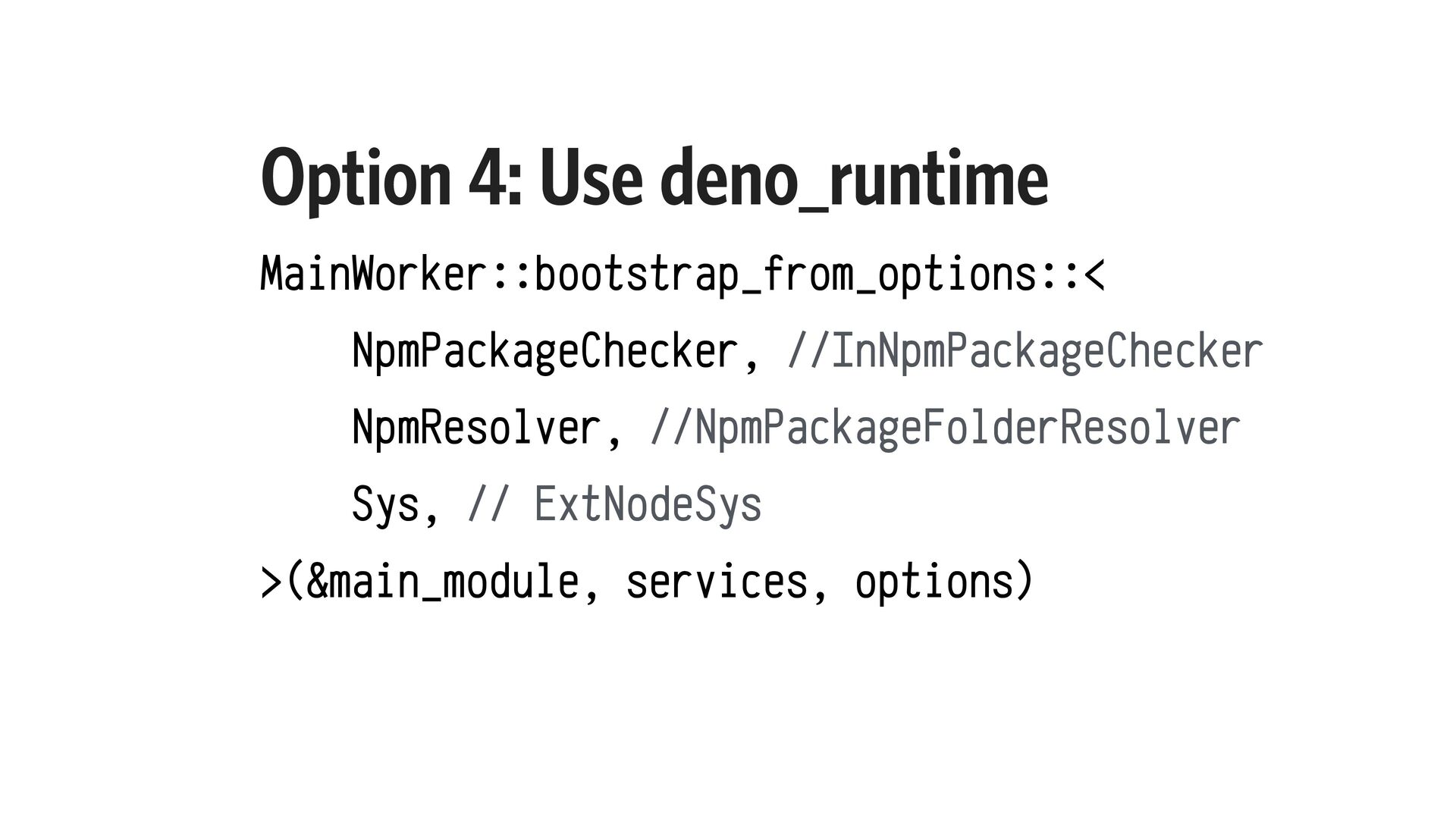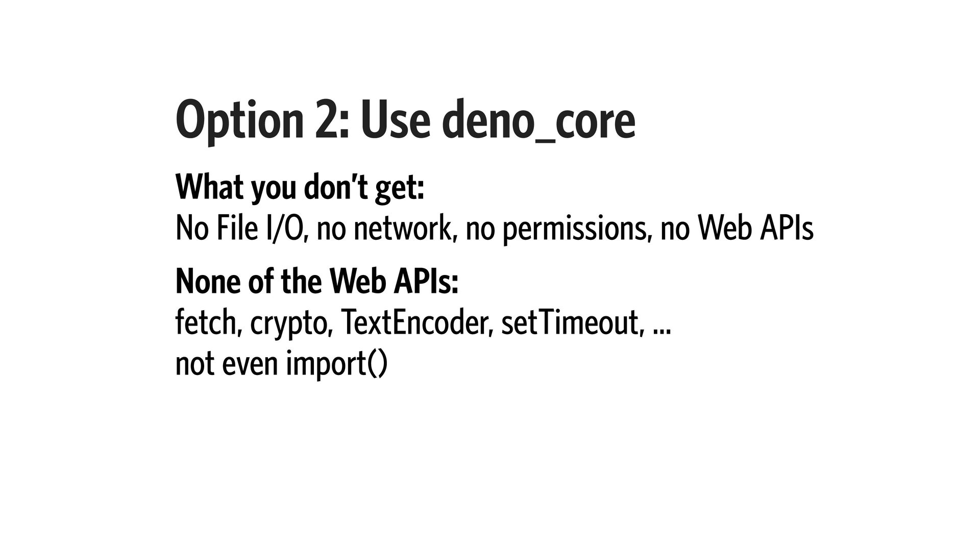 10. Option 2: Use deno_core What you don’t get: No File