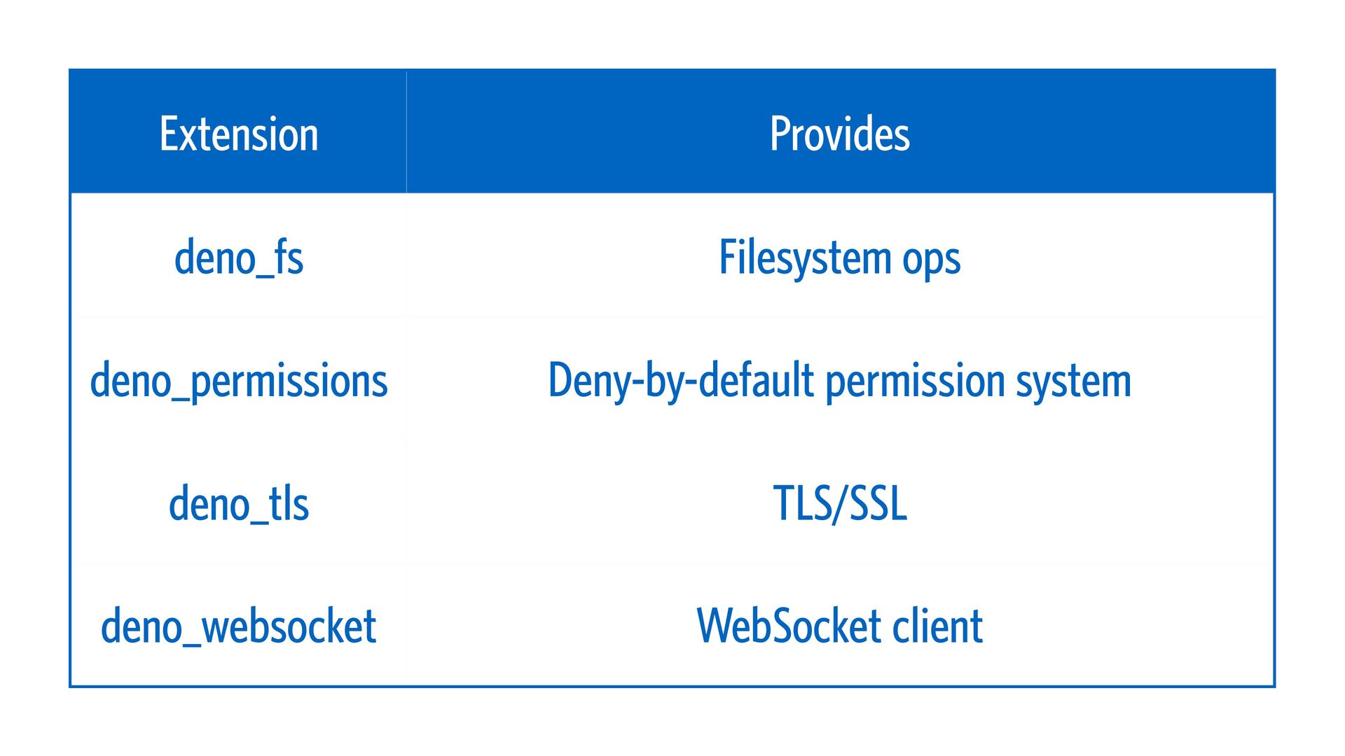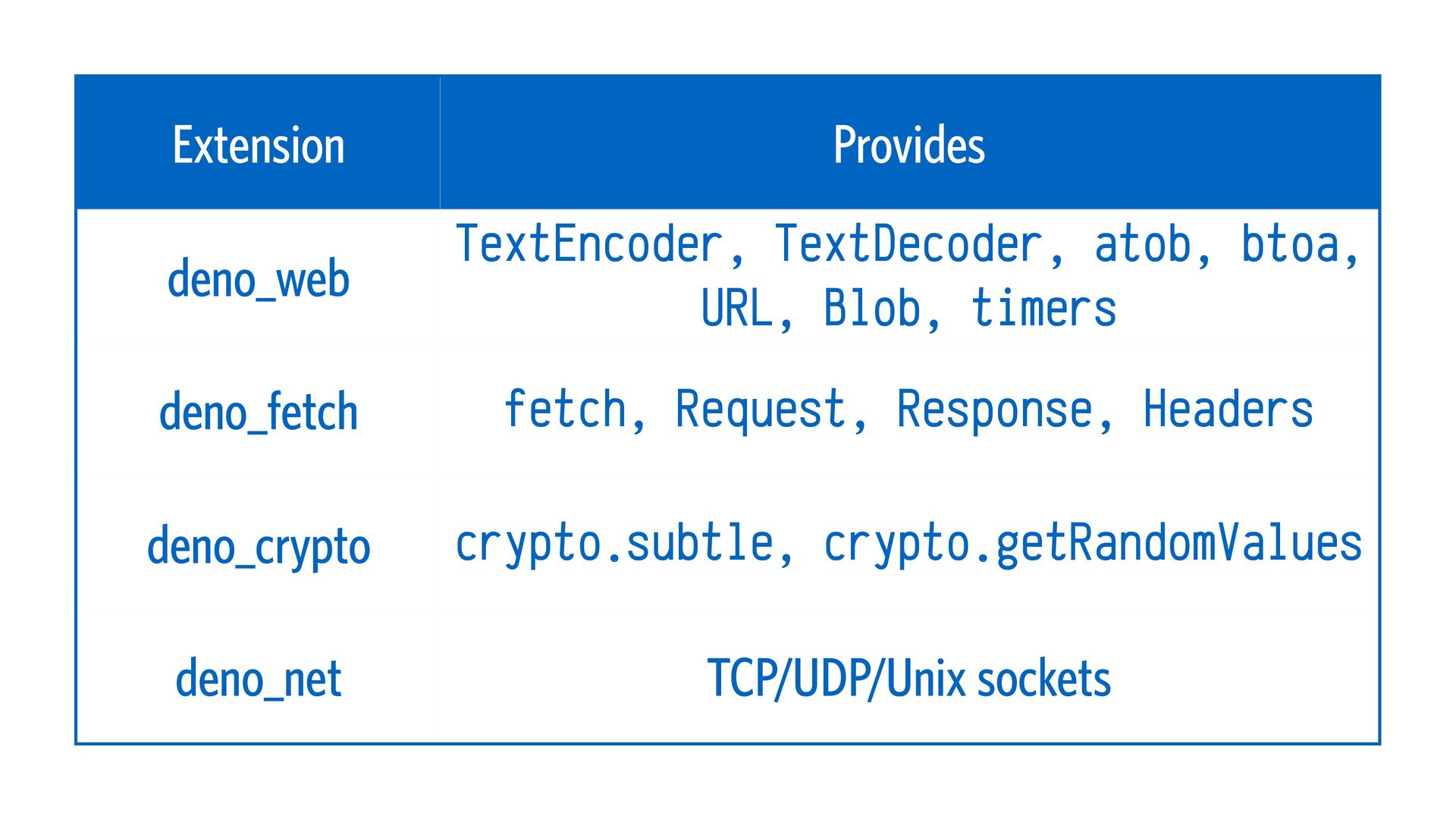 deno_fetch fetch, Request, Response, Headers deno_crypto crypto.subtle, crypto.getRandomValues deno_net TCP/UDP/Unix sockets