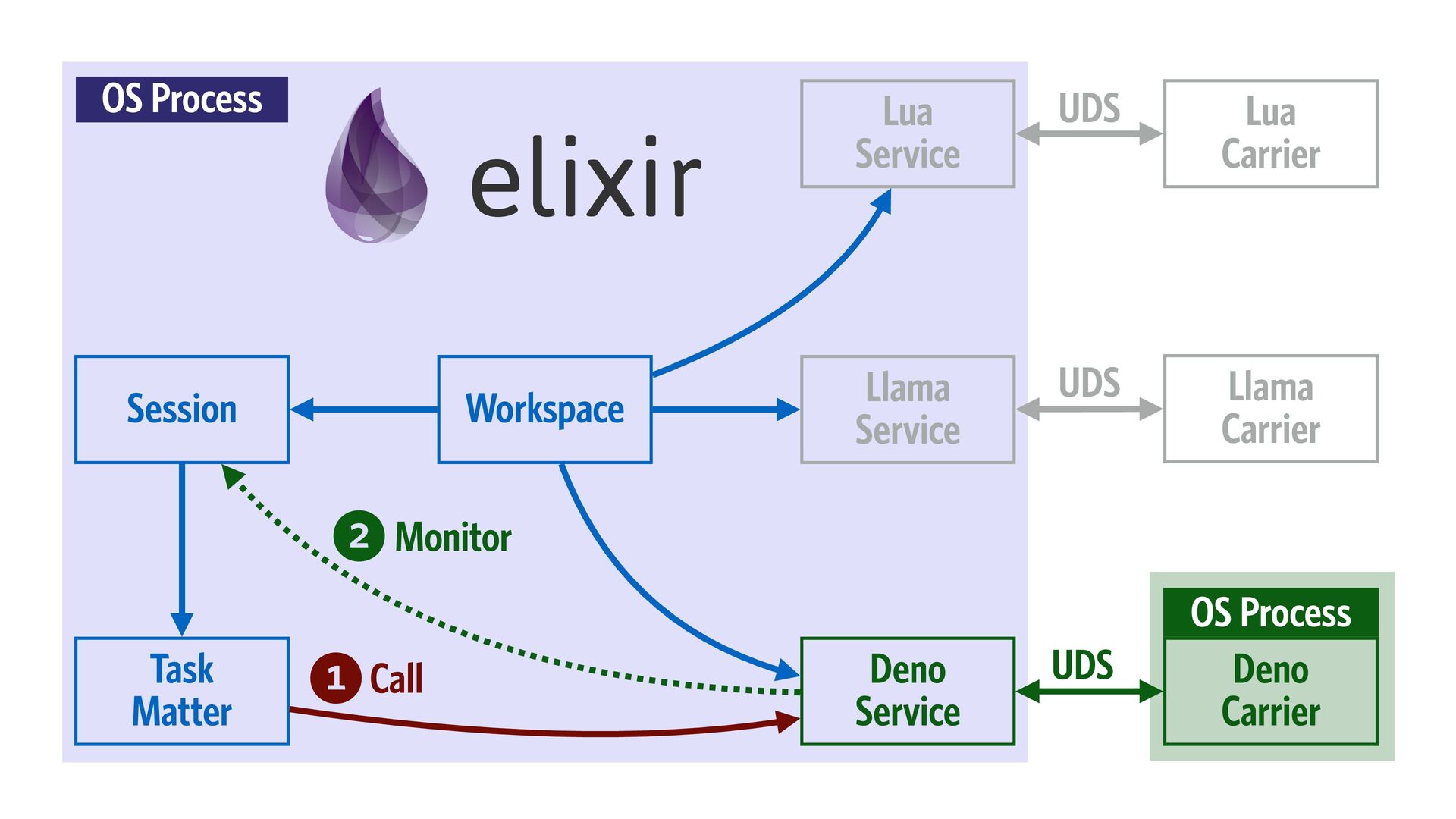 Deno Service Deno Carrier Task Matter OS Process Call Monitor OS Process UDS UDS UDS 1 2