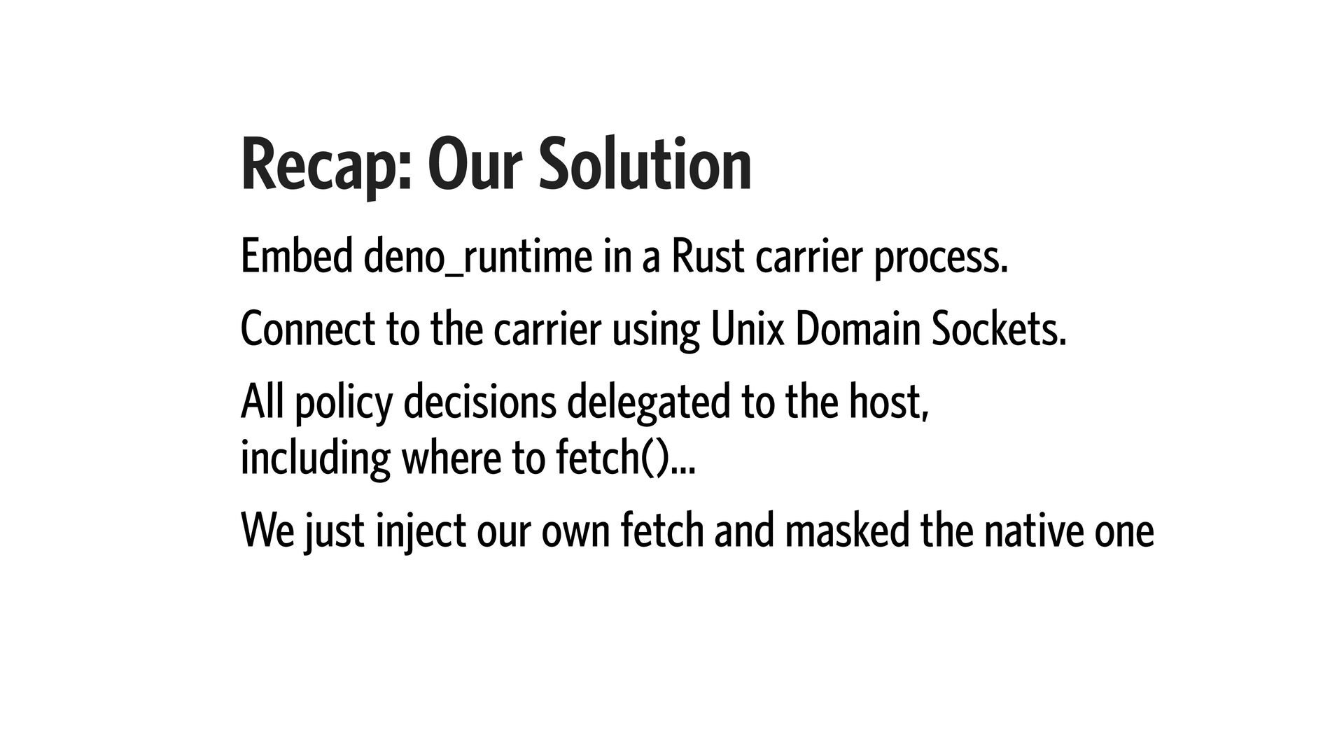14. Recap: Our Solution Embed deno_runtime in a Rust carrier process.