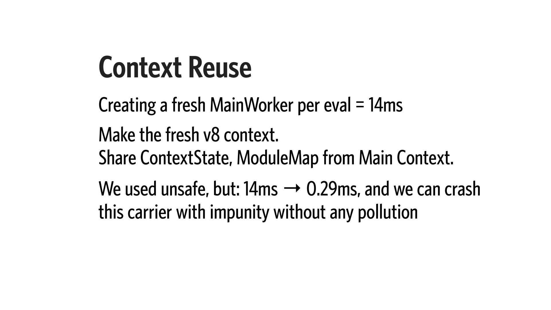 15. Context Reuse Creating a fresh MainWorker per eval = 14ms