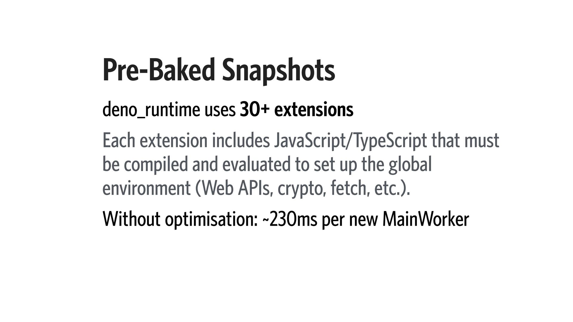 that must be compiled and evaluated to set up the global environment (Web APIs, crypto, fetch, etc.). Without optimisation: ~230ms per new MainWorker