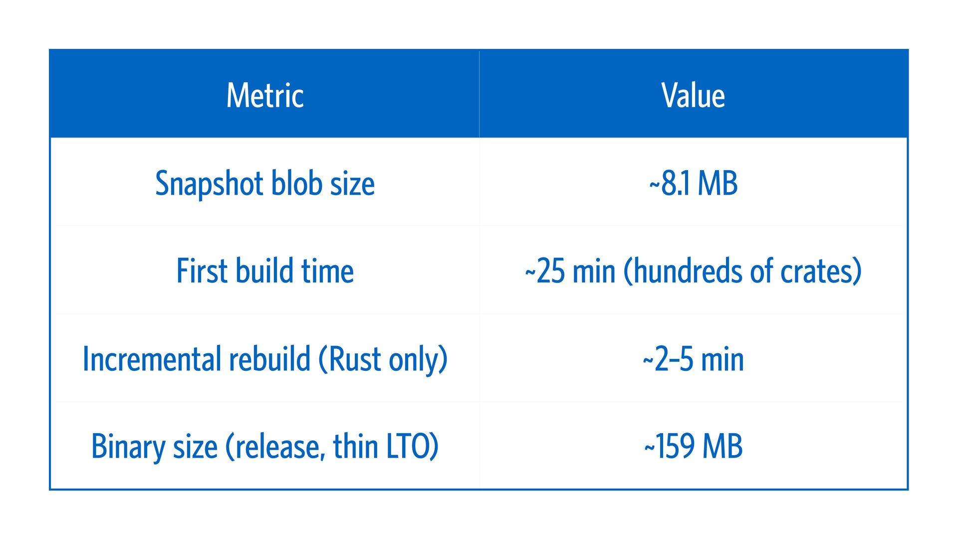 ~25 min (hundreds of crates) Incremental rebuild (Rust only) ~2–5 min Binary size (release, thin LTO) ~159 MB