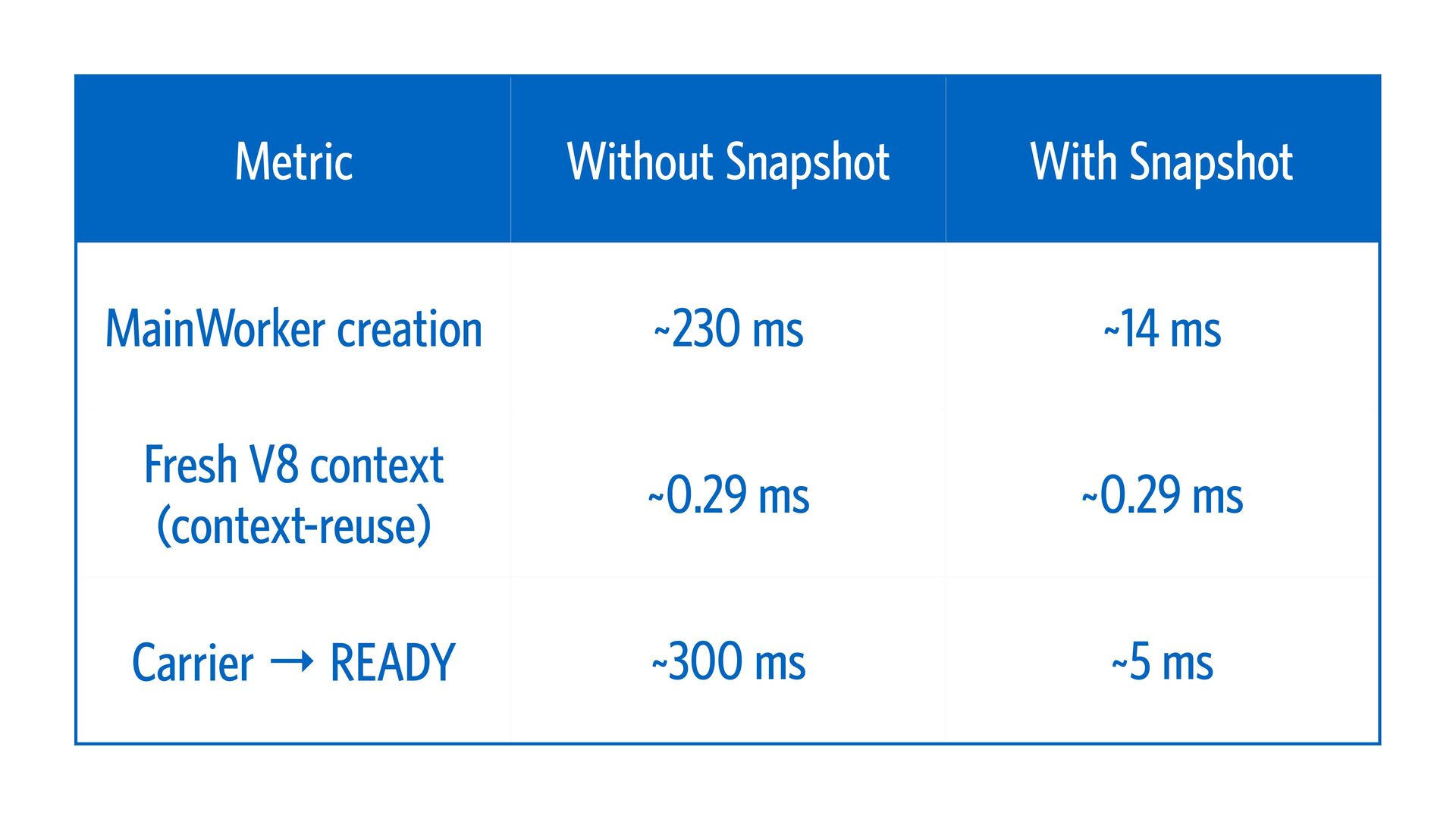 ms Fresh V8 context (context-reuse) ~0.29 ms ~0.29 ms Carrier → READY ~300 ms ~5 ms