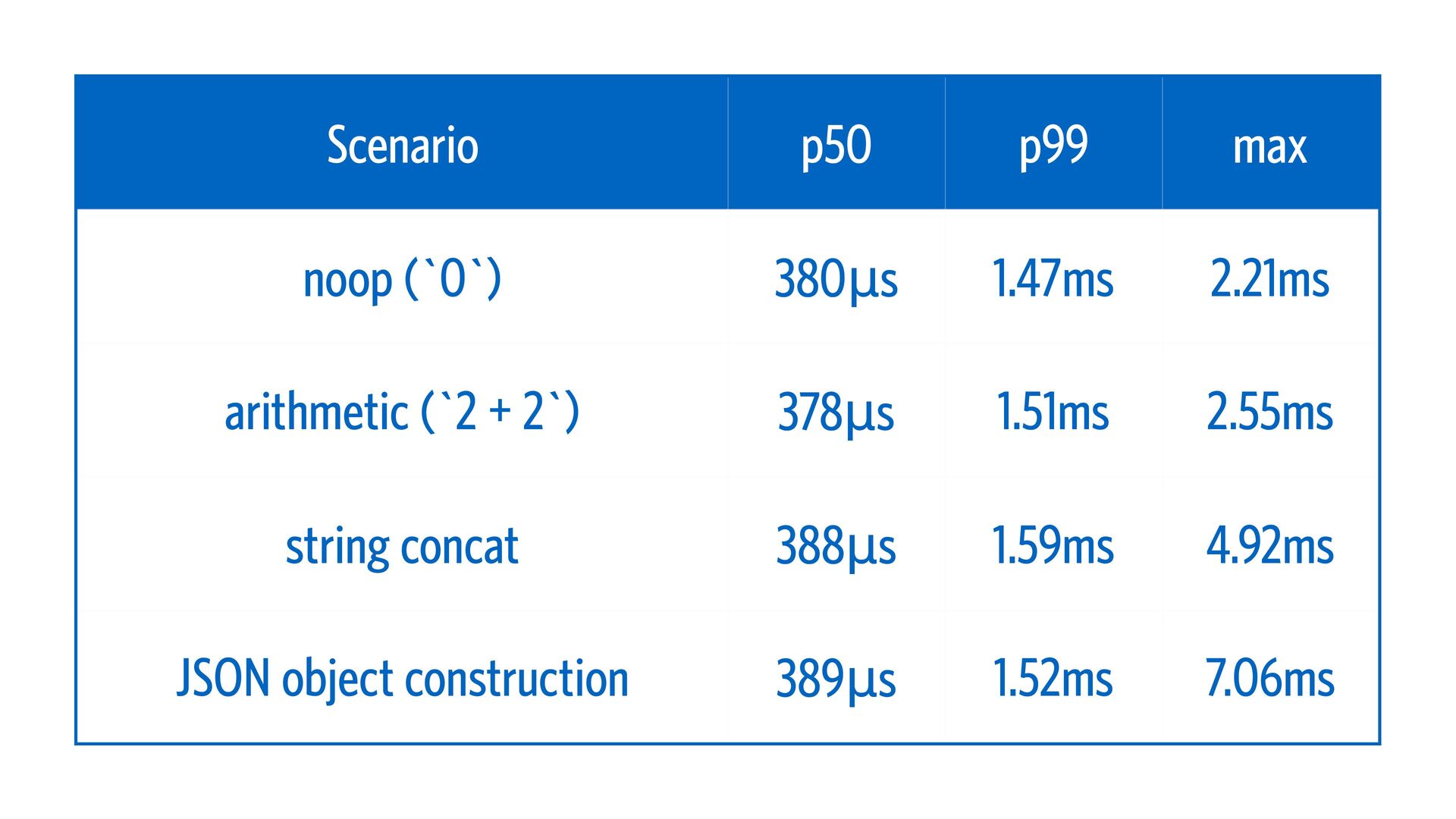 20. Scenario p50 p99 max noop (`0`) 380μs 1.47ms 2.21ms arithmetic