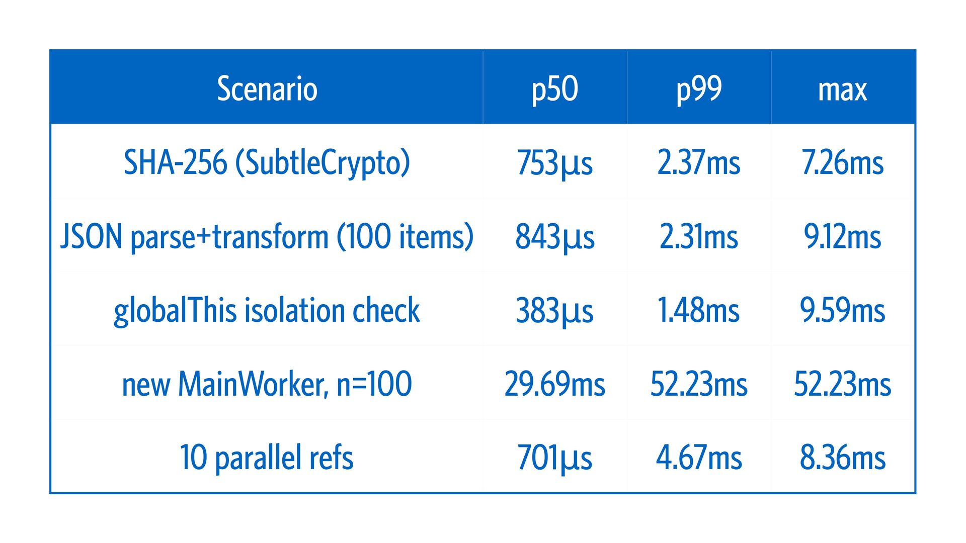 21. Scenario p50 p99 max SHA-256 (SubtleCrypto) 753μs 2.37ms 7.26ms JSON