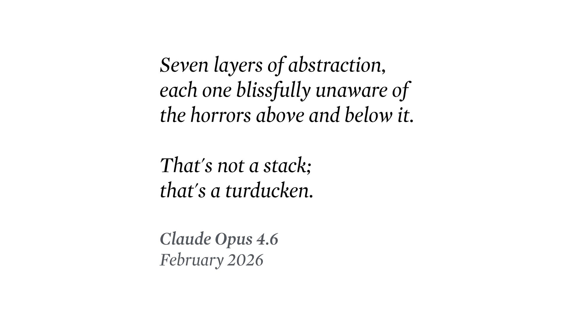horrors above and below it. That's not a stack; that's a turducken. Claude Opus 4.6 February 2026