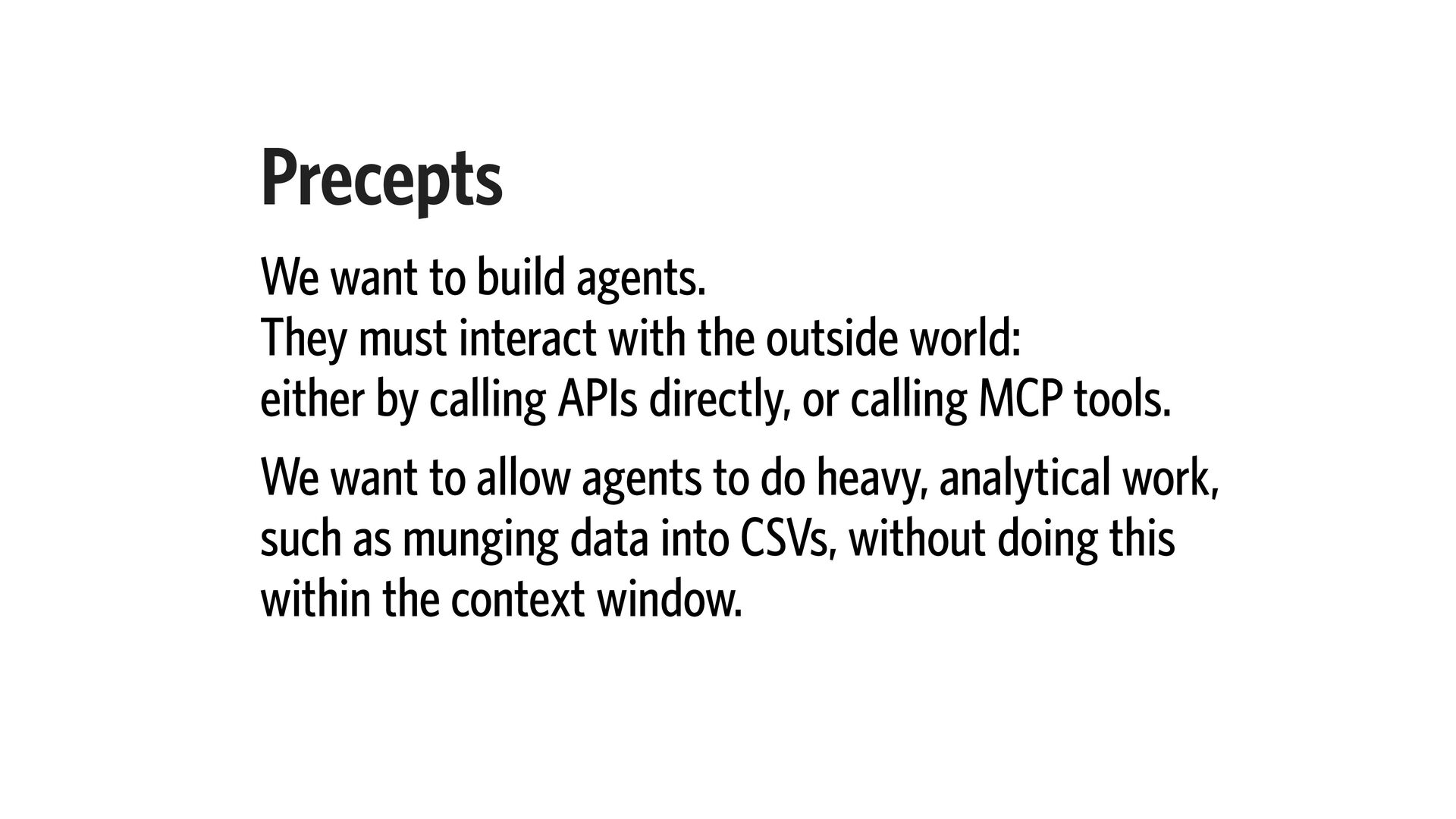the outside world: either by calling APIs directly, or calling MCP tools. We want to allow agents to do heavy, analytical work, such as munging data into CSVs, without doing this within the context window.