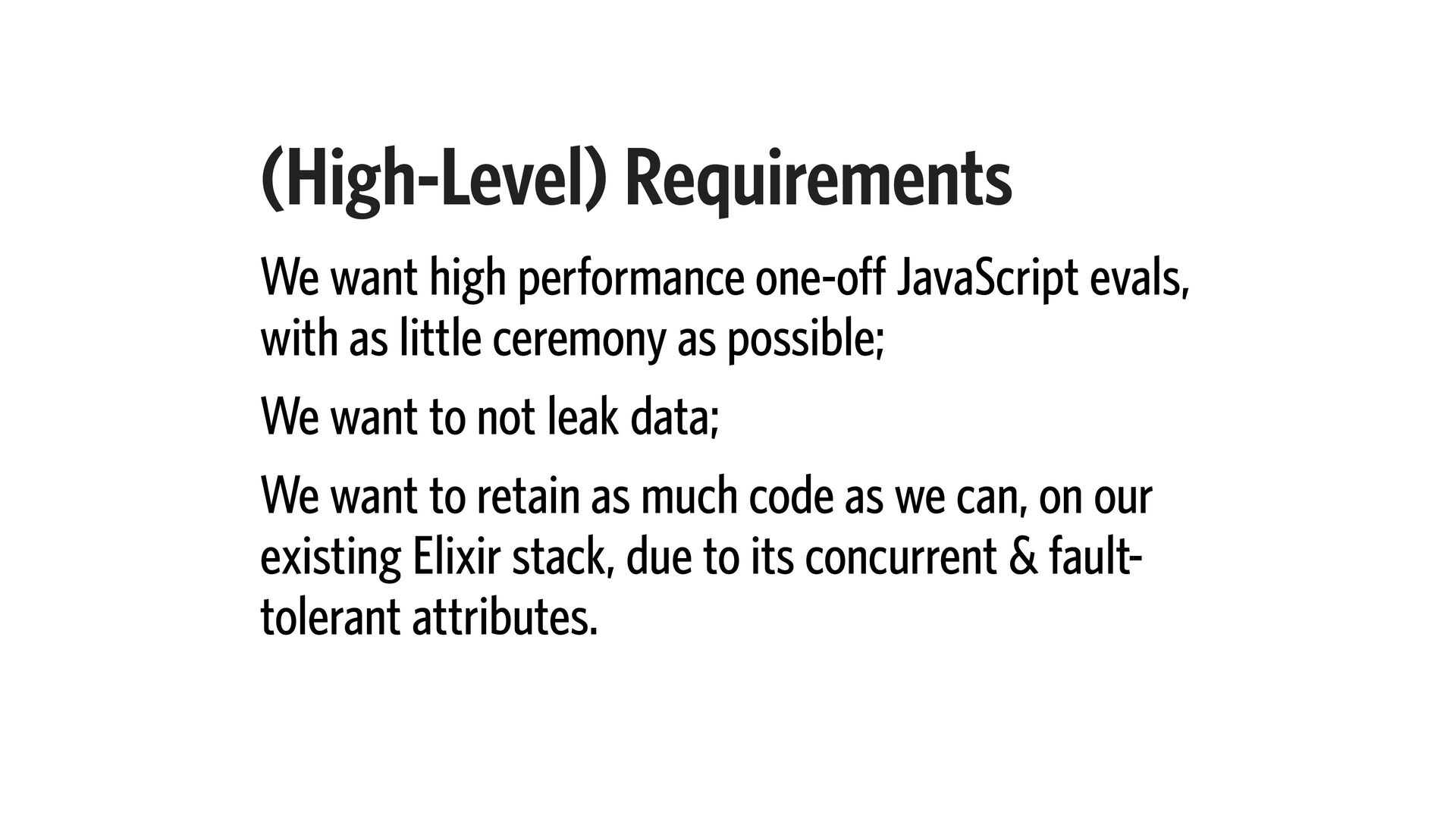 as little ceremony as possible; We want to not leak data; We want to retain as much code as we can, on our existing Elixir stack, due to its concurrent & fault- tolerant attributes.