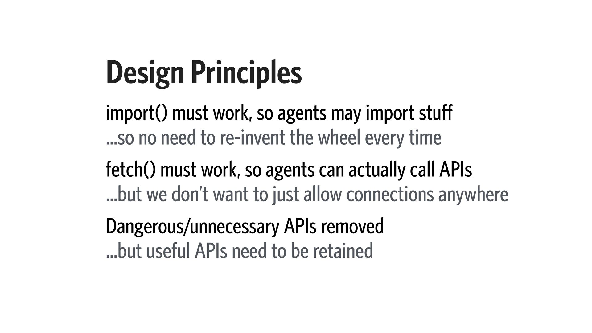 …so no need to re-invent the wheel every time fetch() must work, so agents can actually call APIs …but we don’t want to just allow connections anywhere Dangerous/unnecessary APIs removed …but useful APIs need to be retained