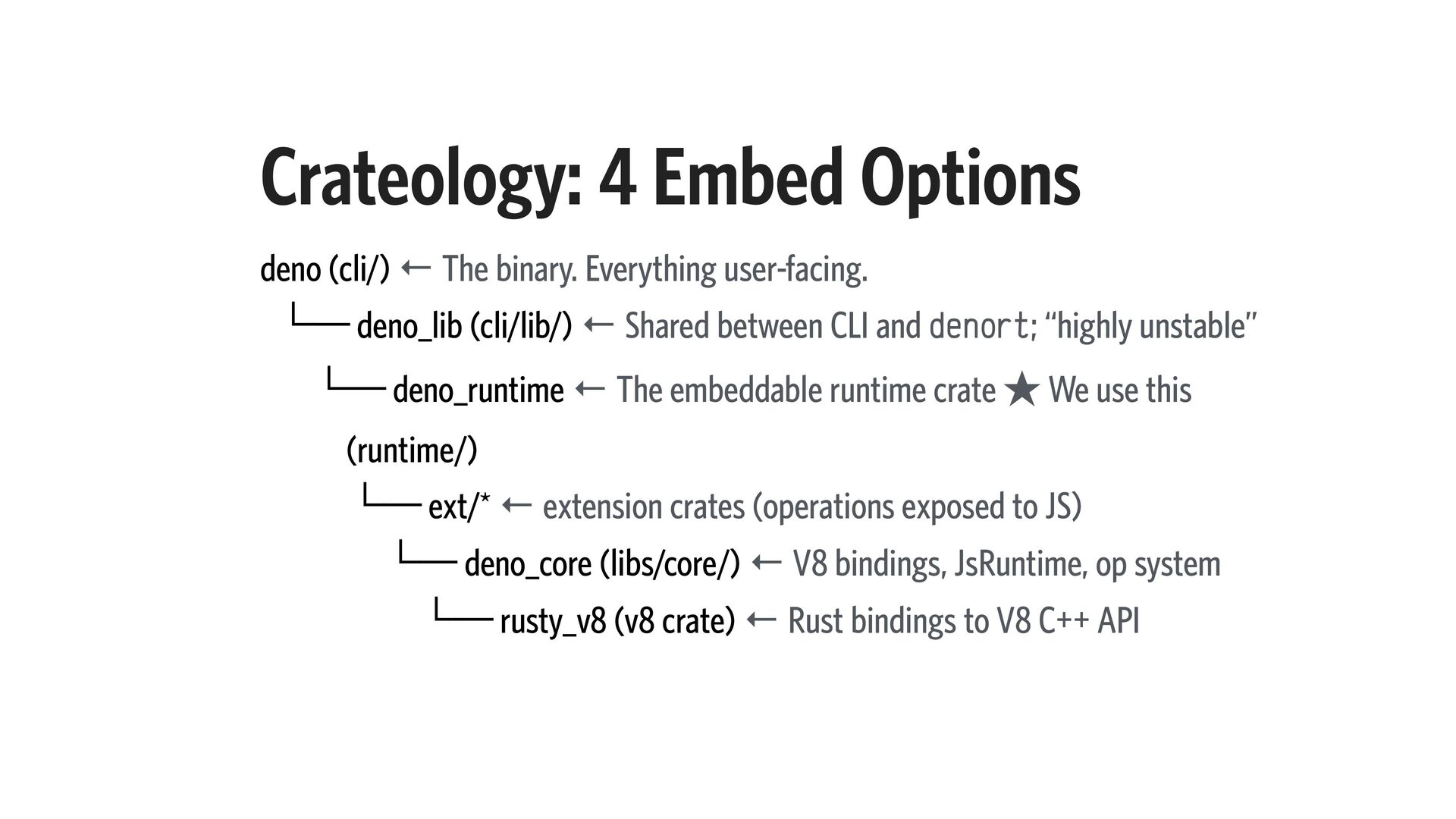 5. Crateology: 4 Embed Options deno (cli/) ← The binary. Everything