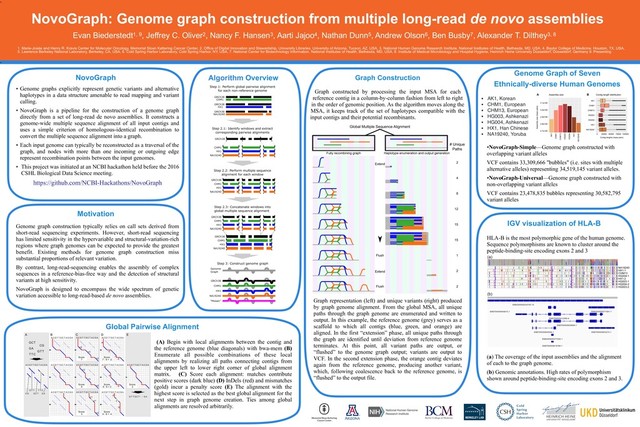 novo assemblies 1. Marie-Josée and Henry R. Kravis Center for Molecular Oncology, Memorial Sloan Kettering Cancer Center, 2. Office of Digital Innovation and Stewardship, University Libraries, University of Arizona, Tucson, AZ, USA, 3. National Human Genome Research Institute, National Institutes of Health, Bethesda, MD, USA, 4. Baylor College of Medicine, Houston, TX, USA, 5. Lawrence Berkeley National Laboratory, Berkeley, CA, USA, 6. Cold Spring Harbor Laboratory, Cold Spring Harbor, NY, USA, 7. National Center for Biotechnology Information, National Institutes of Health, Bethesda, MD, USA, 8. Institute of Medical Microbiology and Hospital Hygiene, Heinrich Heine University Düsseldorf, Düsseldorf, Germany 9. Presenting NovoGraph Graph Construction Graph constructed by processing the input MSA for each reference contig in a column-by-column fashion from left to right in the order of genomic position. As the algorithm moves along the MSA, it keeps track of the set of haplotypes compatible with the input contigs and their potential recombinants. Motivation Global Pairwise Alignment (A) Begin with local alignments between the contig and the reference genome (blue diagonals) with bwa-mem (B) Enumerate all possible combinations of these local alignments by realizing all paths connecting contigs from the upper left to lower right corner of global alignment matrix. (C) Score each alignment: matches contribute positive scores (dark blue) (D) InDels (red) and mismatches (gold) incur a penalty score (E) The alignment with the highest score is selected as the best global alignment for the next step in graph genome creation. Ties among global alignments are resolved arbitrarily. Graph representation (left) and unique variants (right) produced by graph genome alignment. From the global MSA, all unique paths through the graph genome are enumerated and written to output. In this example, the reference genome (grey) serves as a scaffold to which all contigs (blue, green, and orange) are aligned. In the first “extension” phase, all unique paths through the graph are identified until deviation from reference genome terminates. At this point, all variant paths are output, or “flushed” to the genome graph output; variants are output to VCF. In the second extension phase, the orange contig deviates again from the reference genome, producing another variant, which, following coalescence back to the reference genome, is “flushed” to the output file. • Genome graphs explicitly represent genetic variants and alternative haplotypes in a data structure amenable to read mapping and variant calling. • NovoGraph is a pipeline for the construction of a genome graph directly from a set of long-read de novo assemblies. It constructs a genome-wide multiple sequence alignment of all input contigs and uses a simple criterion of homologous-identical recombination to convert the multiple sequence alignment into a graph. • Each input genome can typically be reconstructed as a traversal of the graph, and nodes with more than one incoming or outgoing edge represent recombination points between the input genomes. • This project was initiated at an NCBI hackathon held before the 2016 CSHL Biological Data Science meeting. https://github.com/NCBI-Hackathons/NovoGraph Genome graph construction typically relies on call sets derived from short-read sequencing experiments. However, short-read sequencing has limited sensitivity in the hypervariable and structural-variation-rich regions where graph genomes can be expected to provide the greatest benefit. Existing methods for genome graph construction miss substantial proportions of relevant variation. By contrast, long-read-sequencing enables the assembly of complex sequences in a reference-bias-free way and the detection of structural variants at high sensitivity. NovoGraph is designed to encompass the wide spectrum of genetic variation accessible to long-read-based de novo assemblies. Algorithm Overview (a) The coverage of the input assemblies and the alignment of each to the graph genome. (b) Genomic annotations. High rates of polymorphism shown around peptide-binding-site encoding exons 2 and 3. HLA-B is the most polymorphic gene of the human genome. Sequence polymorphisms are known to cluster around the peptide-binding-site encoding exons 2 and 3 Evan Biederstedt1, 9, Jeffrey C. Oliver2, Nancy F. Hansen3, Aarti Jajoo4, Nathan Dunn5, Andrew Olson6, Ben Busby7, Alexander T. Dilthey3, 8 •NovoGraph-Simple—Genome graph constructed with overlapping variant alleles VCF contains 33,309,666 "bubbles" (i.e. sites with multiple alternative alleles) representing 34,519,145 variant alleles. •NovoGraph-Universal—Genome graph constructed with non-overlapping variant alleles VCF contains 23,478,835 bubbles representing 30,582,795 variant alleles Genome Graph of Seven Ethnically-diverse Human Genomes • AK1, Korean • CHM1, European • CHM13, European • HG003, Ashkenazi • HG004, Ashkenazi • HX1, Han Chinese • NA19240, Yoruba IGV visualization of HLA-B