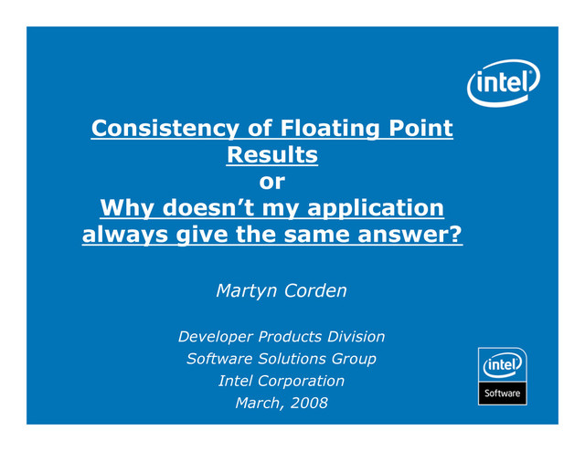 and names may be claimed as the property of others 17 The Floating Point Unit (FPU) Environment • FP Control Word Settings – Rounding mode (nearest, toward +∞, toward -∞, toward 0) – Exception masks (inexact, underflow, overflow, divide by zero, denormal, invalid) – Flush-to-zero (FTZ), Denormals-are-zero (DAZ) – x87 precision control (single, double, extended) • but beware of changing this! • Status Flags – 11 mapping to exception masks