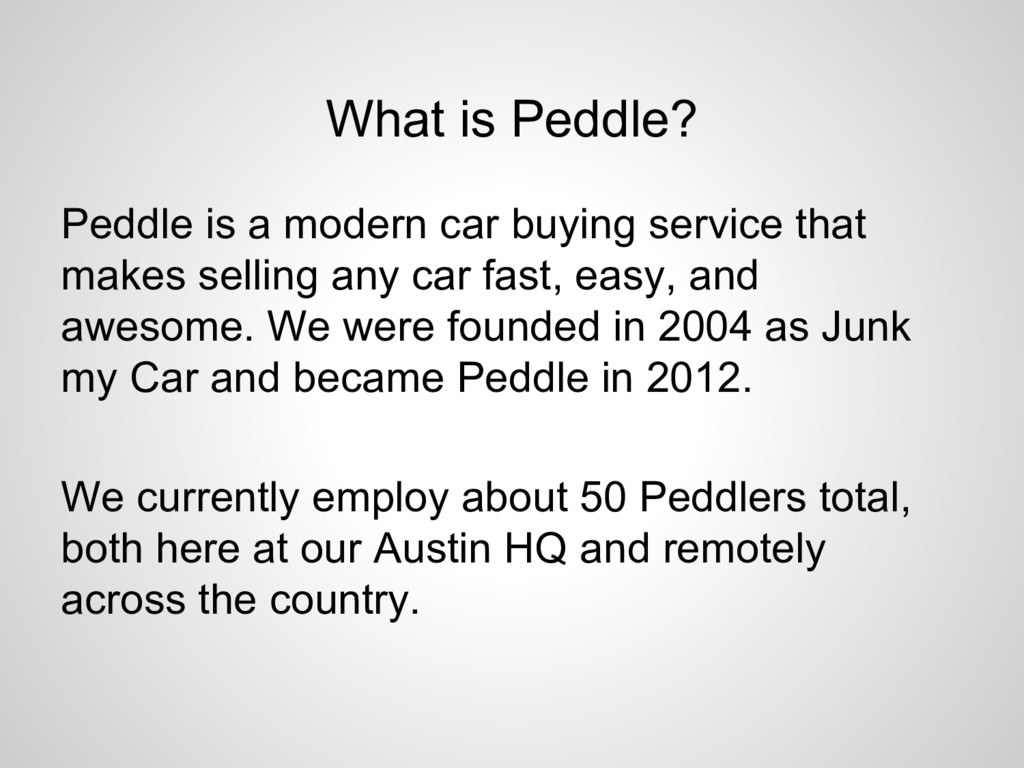 any car fast, easy, and awesome. We were founded in 2004 as Junk my Car and became Peddle in 2012. We currently employ about 50 Peddlers total, both here at our Austin HQ and remotely across the country. What is Peddle?