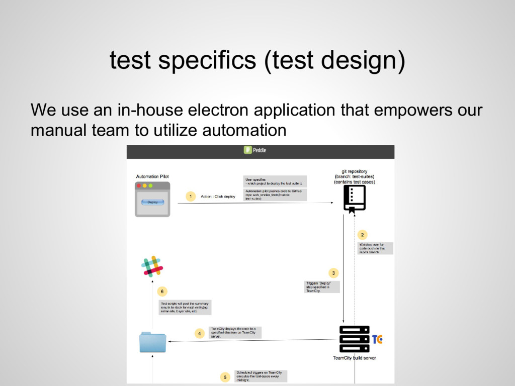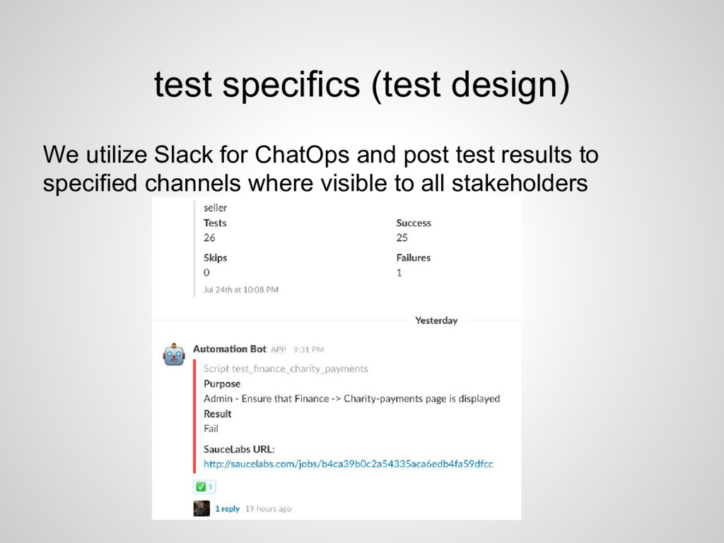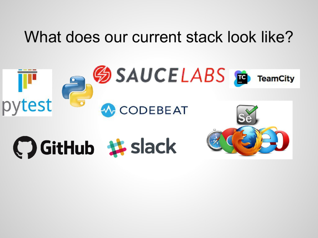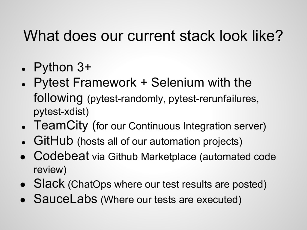 following (pytest-randomly, pytest-rerunfailures, pytest-xdist) • TeamCity (for our Continuous Integration server) • GitHub (hosts all of our automation projects) • Codebeat via Github Marketplace (automated code review) • Slack (ChatOps where our test results are posted) • SauceLabs (Where our tests are executed) What does our current stack look like?
