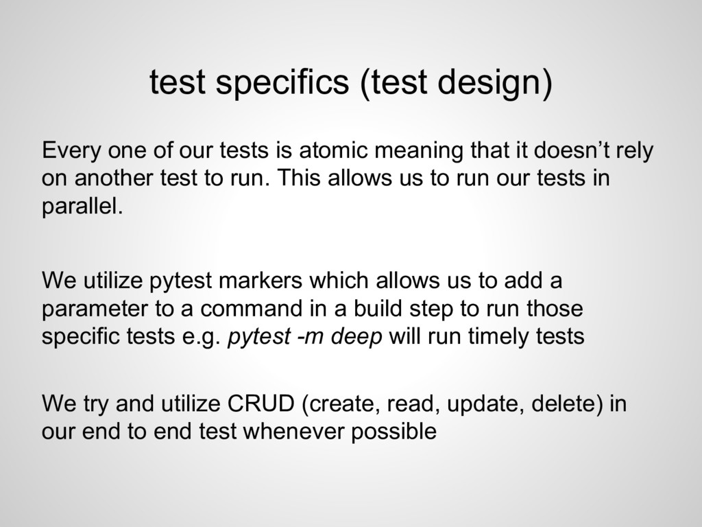 doesn’t rely on another test to run. This allows us to run our tests in parallel. We utilize pytest markers which allows us to add a parameter to a command in a build step to run those specific tests e.g. pytest -m deep will run timely tests We try and utilize CRUD (create, read, update, delete) in our end to end test whenever possible test specifics (test design)