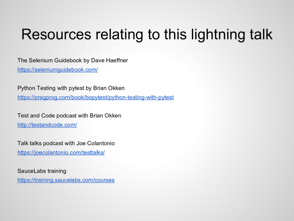 pytest by Brian Okken https://pragprog.com/book/bopytest/python-testing-with-pytest Test and Code podcast with Brian Okken http://testandcode.com/ Talk talks podcast with Joe Colantonio https://joecolantonio.com/testtalks/ SauceLabs training https://training.saucelabs.com/courses Resources relating to this lightning talk