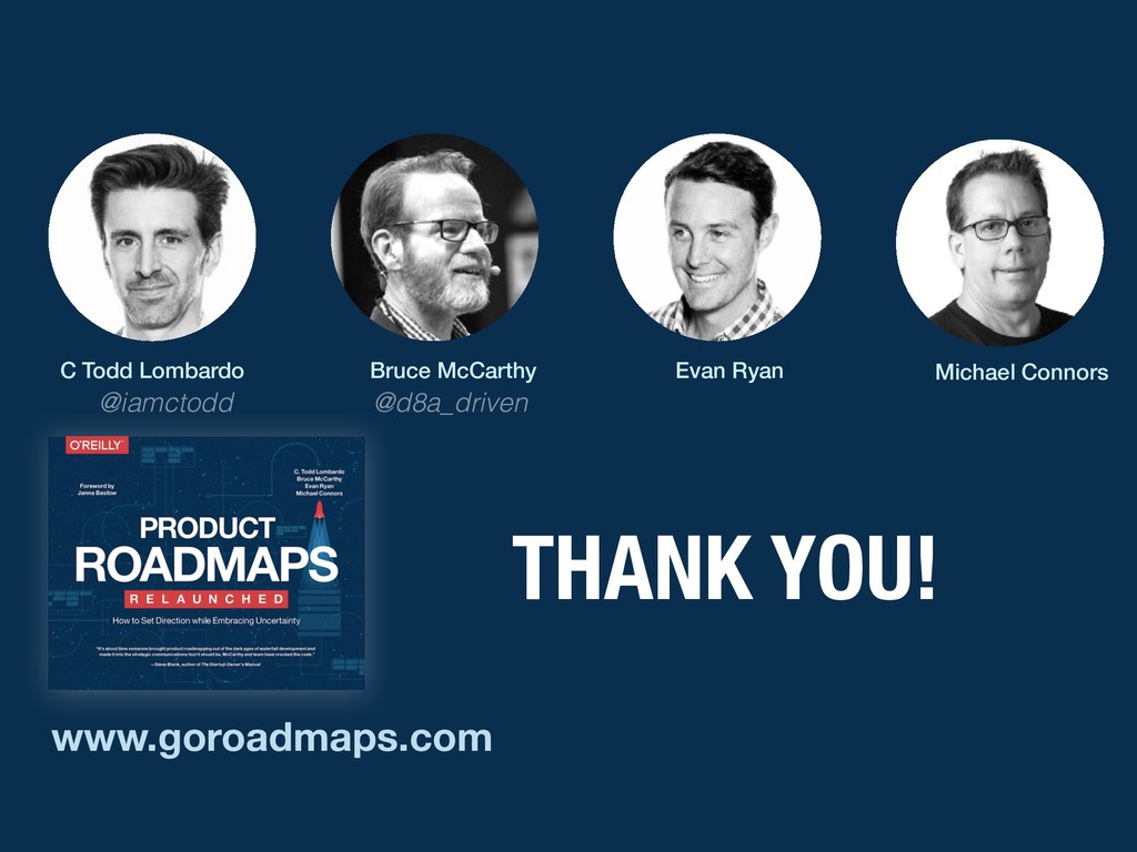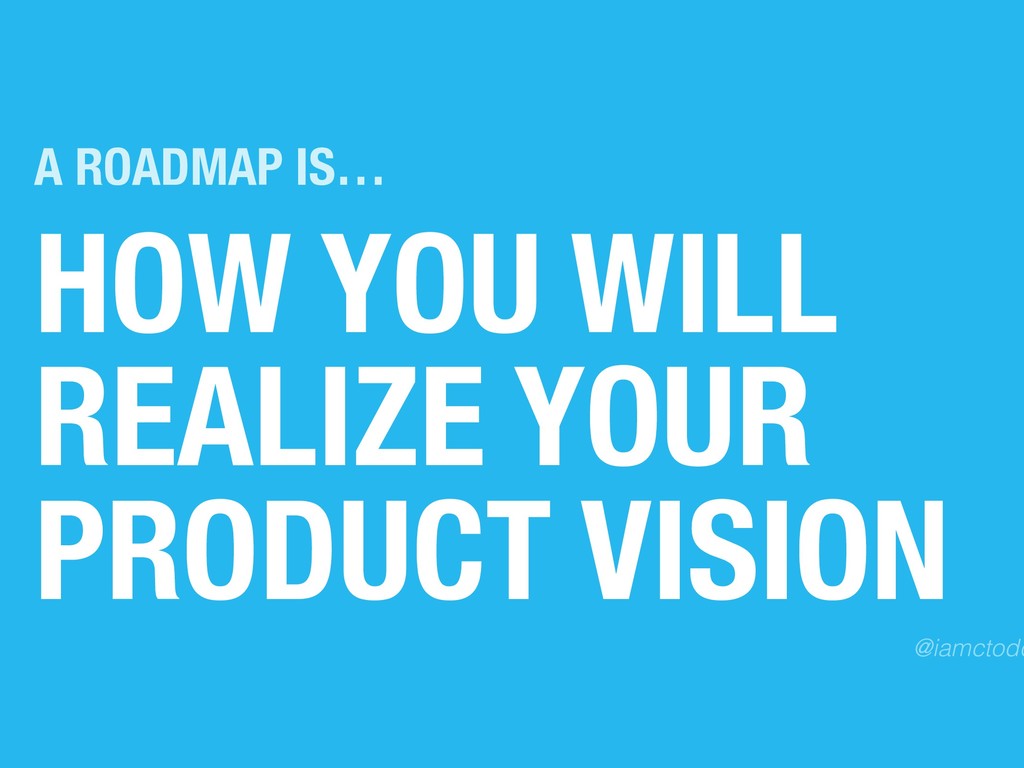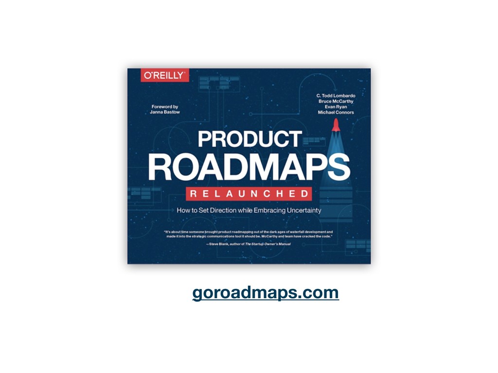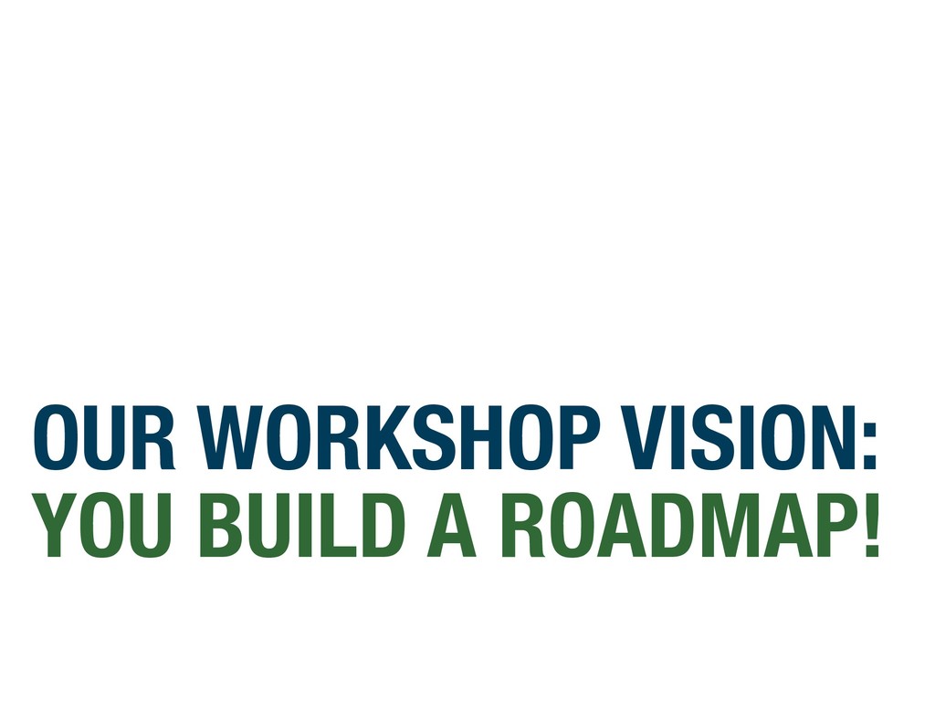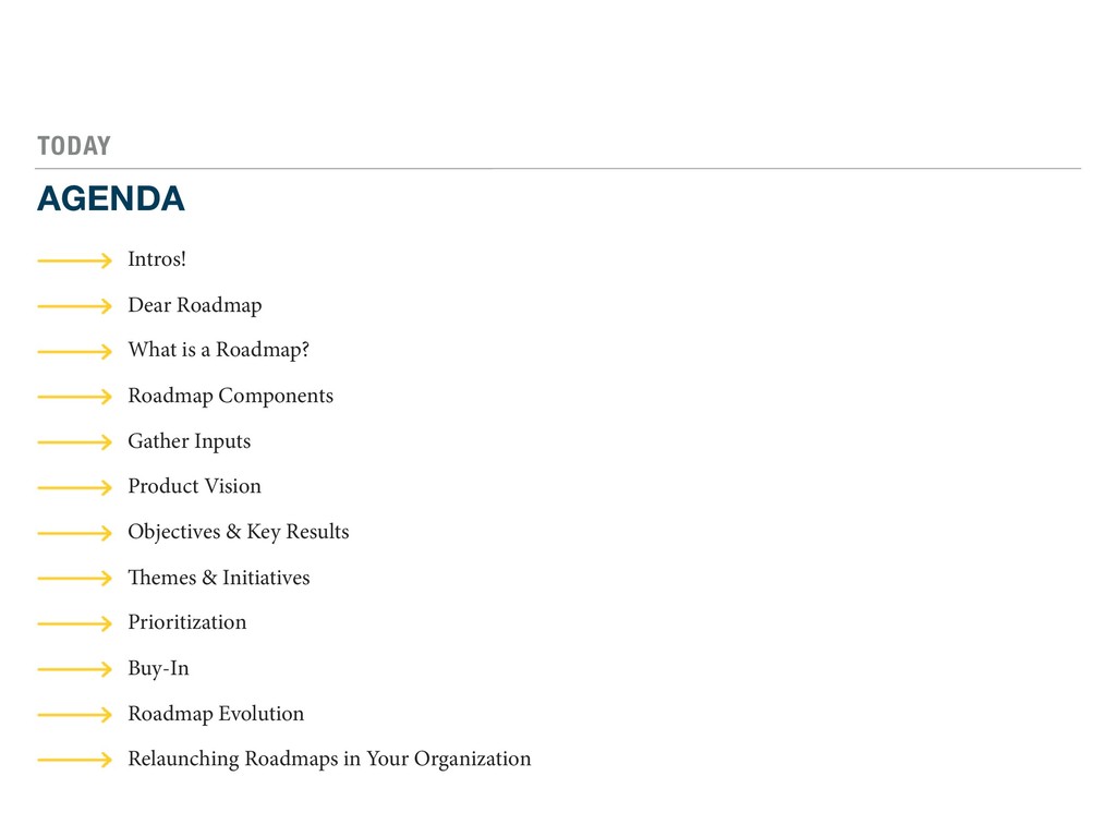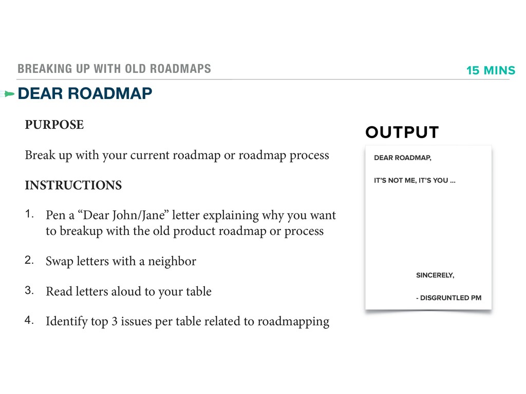with your current roadmap or roadmap process INSTRUCTIONS 1. Pen a “Dear John/Jane” letter explaining why you want to breakup with the old product roadmap or process 2. Swap letters with a neighbor 3. Read letters aloud to your table 4. Identify top 3 issues per table related to roadmapping OUTPUT DEAR ROADMAP, IT’S NOT ME, IT’S YOU … SINCERELY, - DISGRUNTLED PM 15 MINS