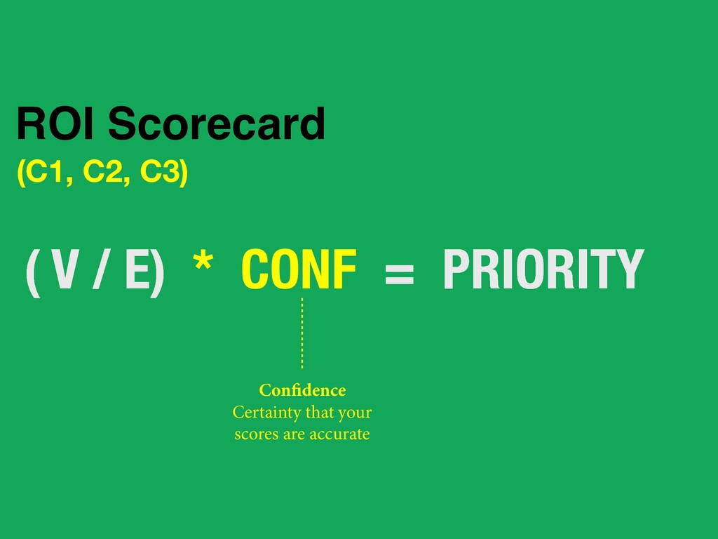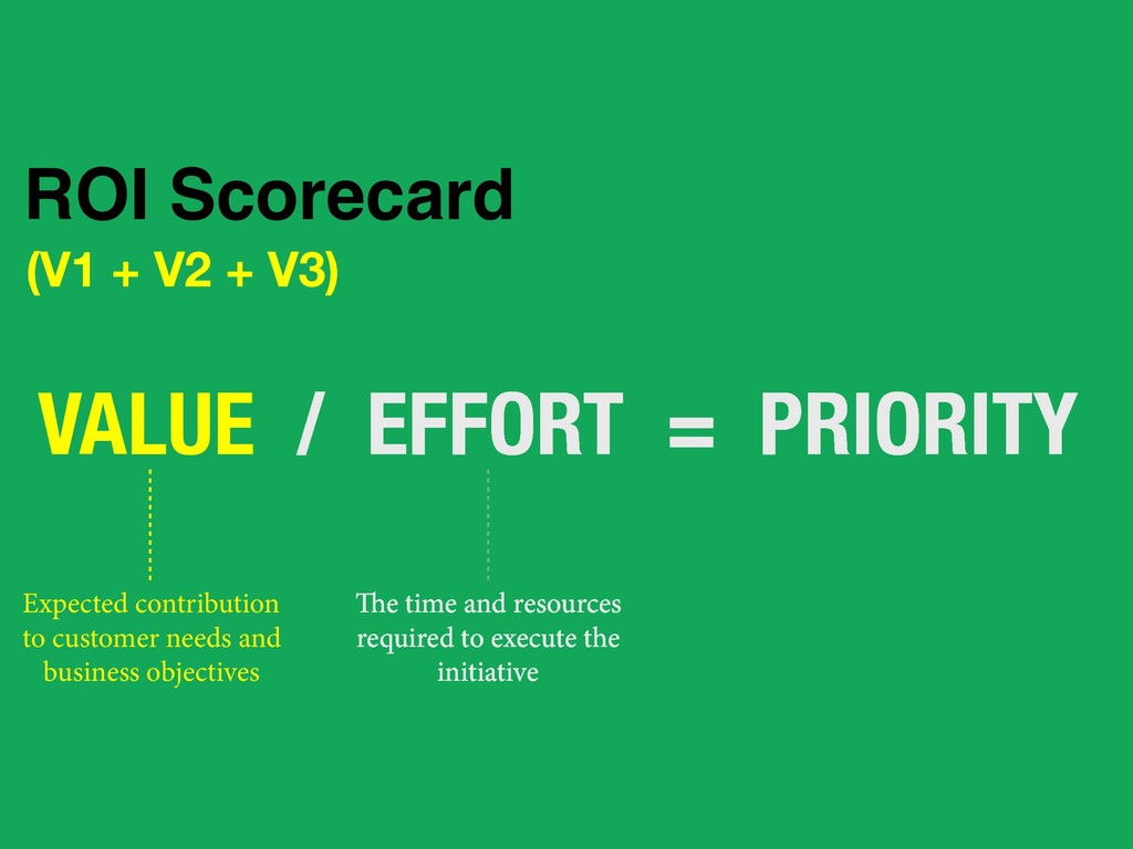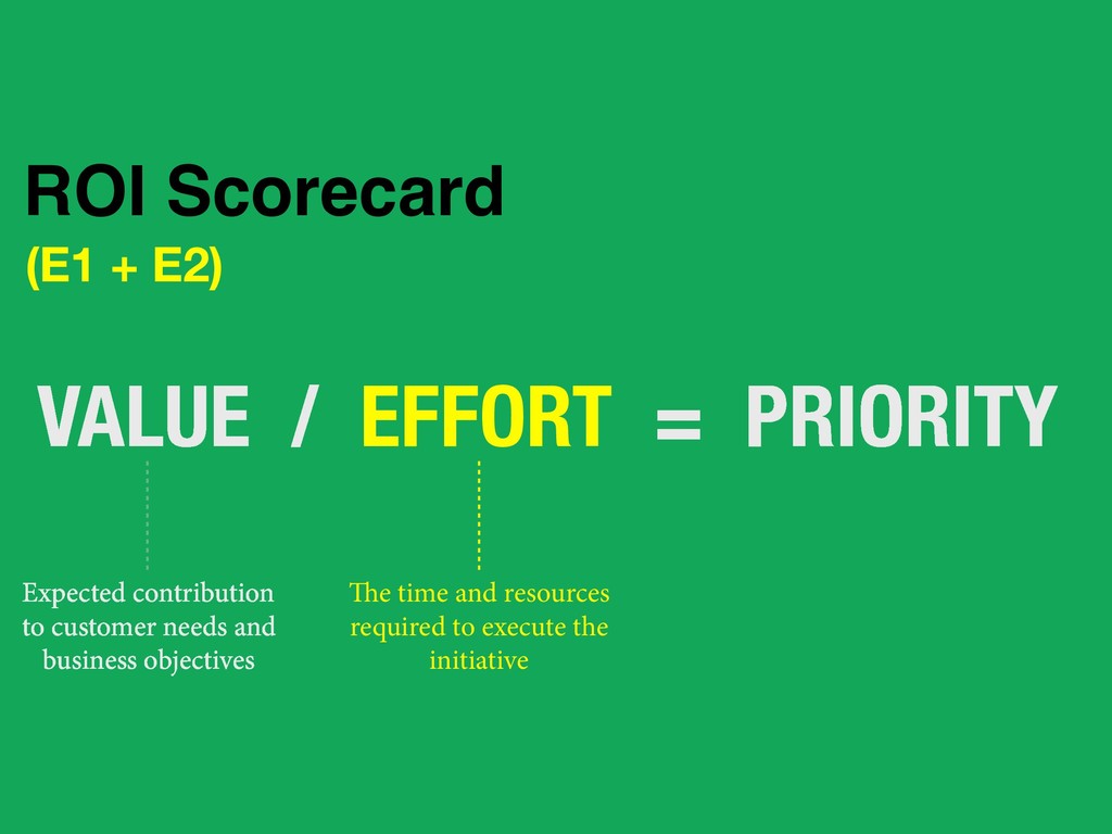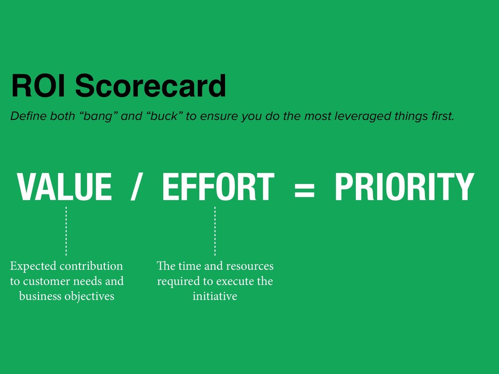 to execute the initiative Expected contribution to customer needs and business objectives ROI Scorecard Define both “bang” and “buck” to ensure you do the most leveraged things first.