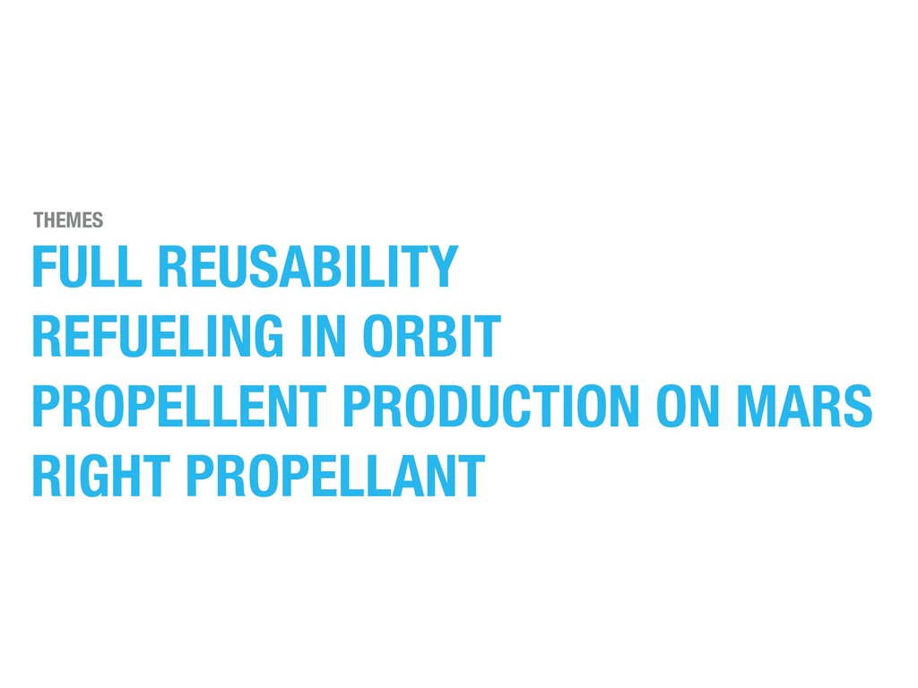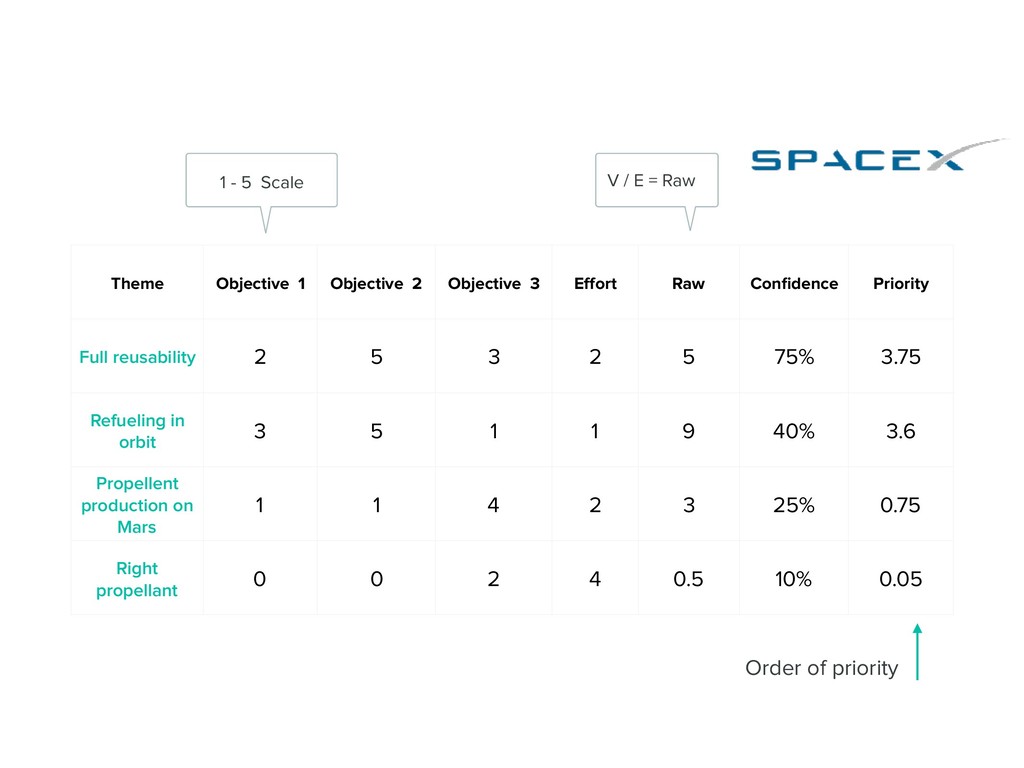 Priority Full reusability 2 5 3 2 5 75% 3.75 Refueling in orbit 3 5 1 1 9 40% 3.6 Propellent production on Mars 1 1 4 2 3 25% 0.75 Right propellant 0 0 2 4 0.5 10% 0.05 Order of priority V / E = Raw 1 - 5 Scale