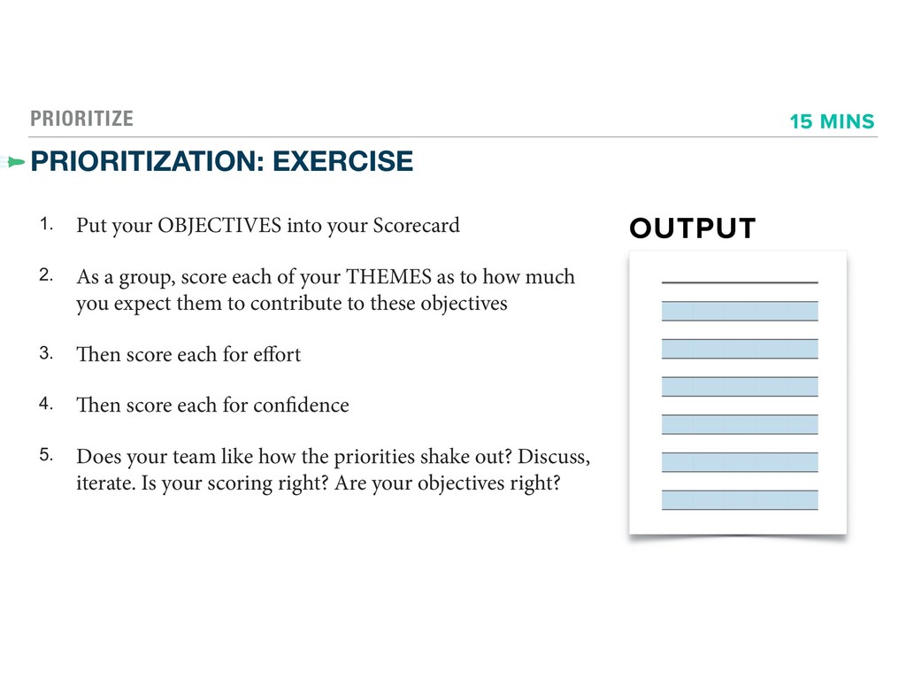 2. As a group, score each of your THEMES as to how much you expect them to contribute to these objectives 3. Then score each for effort 4. Then score each for confidence 5. Does your team like how the priorities shake out? Discuss, iterate. Is your scoring right? Are your objectives right? OUTPUT 15 MINS