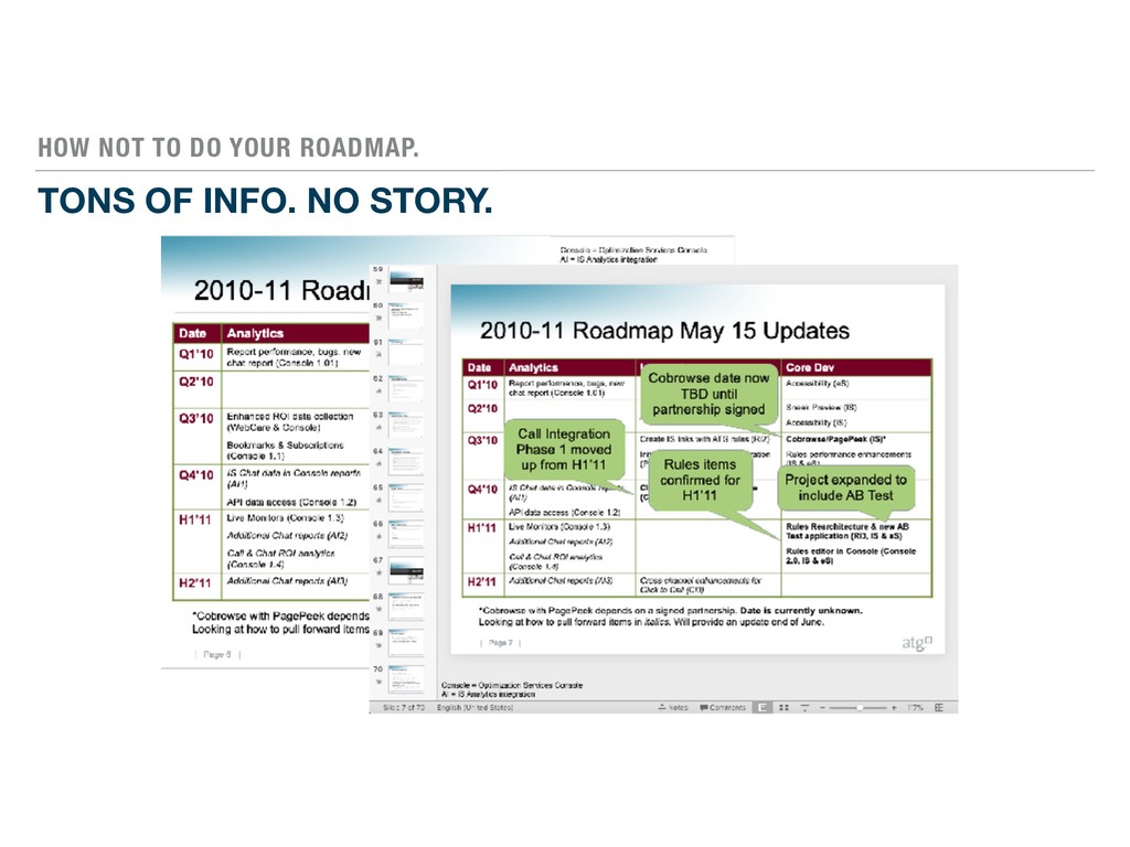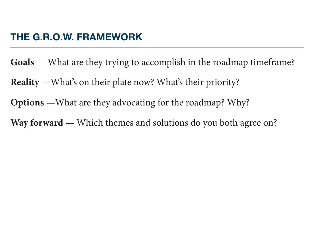 accomplish in the roadmap timeframe? Reality —What’s on their plate now? What’s their priority? Options —What are they advocating for the roadmap? Why? Way forward — Which themes and solutions do you both agree on?