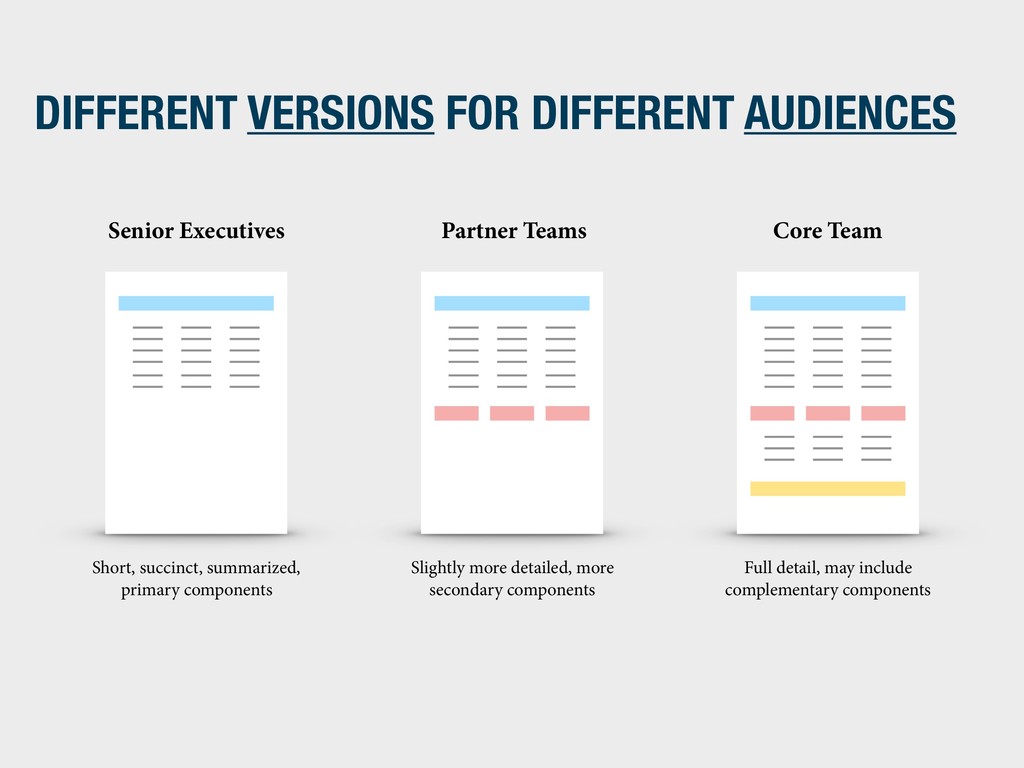 Team Short, succinct, summarized, primary components Slightly more detailed, more secondary components Full detail, may include complementary components