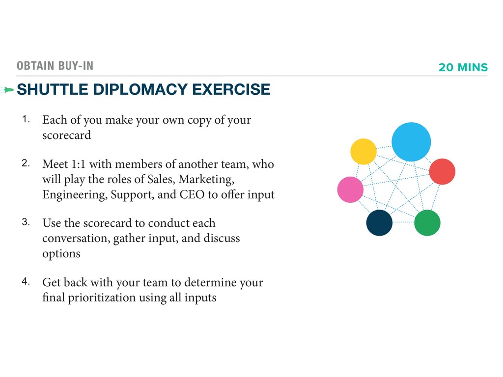 your own copy of your scorecard 2. Meet 1:1 with members of another team, who will play the roles of Sales, Marketing, Engineering, Support, and CEO to offer input 3. Use the scorecard to conduct each conversation, gather input, and discuss options 4. Get back with your team to determine your final prioritization using all inputs 20 MINS