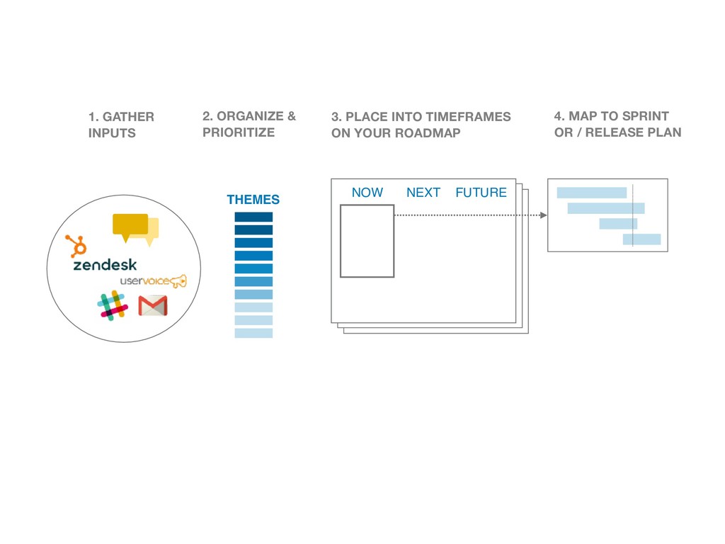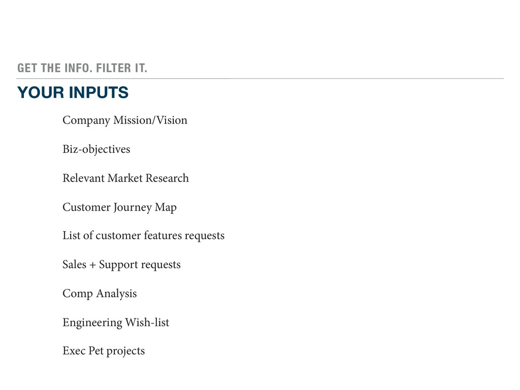 Relevant Market Research Customer Journey Map List of customer features requests Sales + Support requests Comp Analysis Engineering Wish-list Exec Pet projects