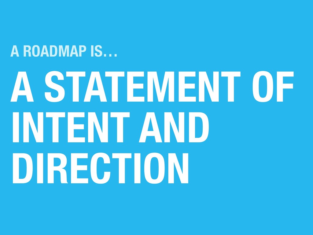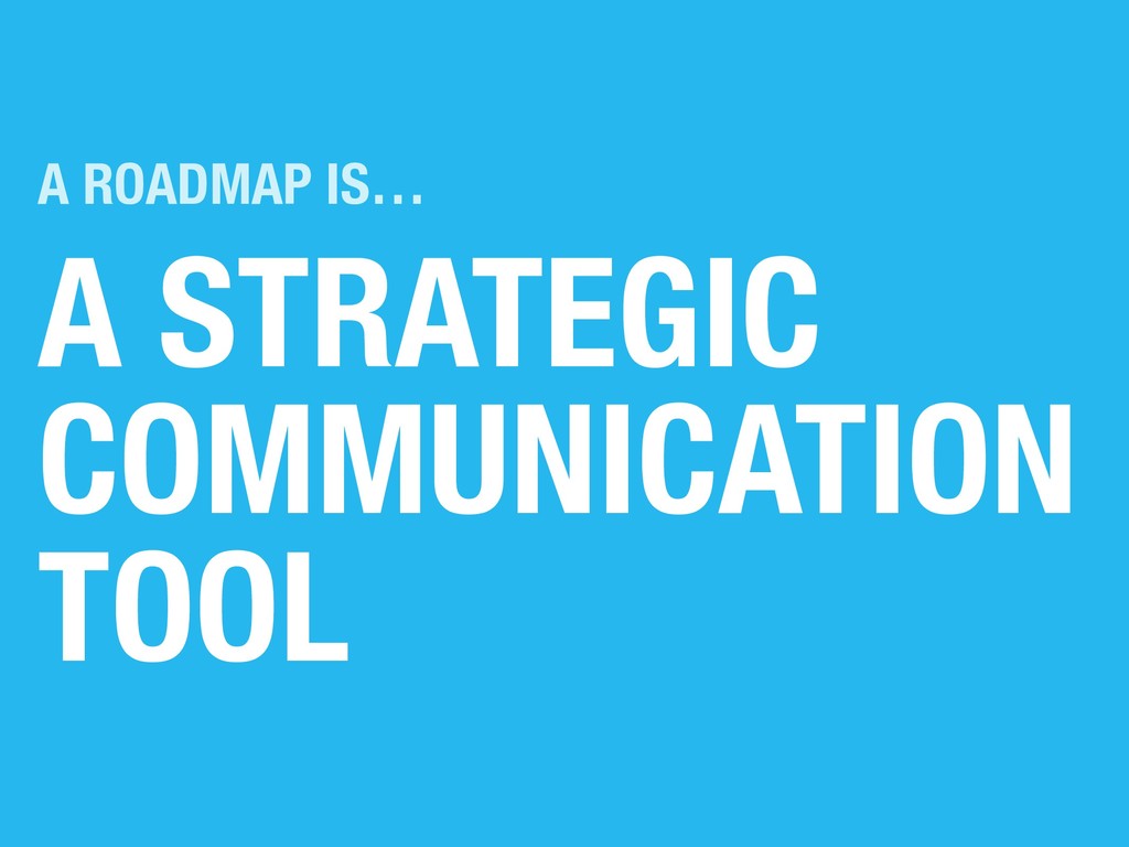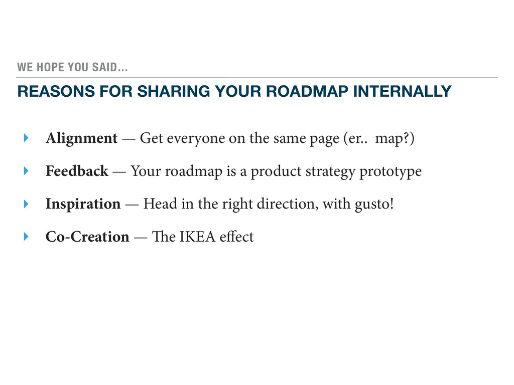 ‣ Alignment — Get everyone on the same page (er.. map?) ‣ Feedback — Your roadmap is a product strategy prototype ‣ Inspiration — Head in the right direction, with gusto! ‣ Co-Creation — The IKEA effect