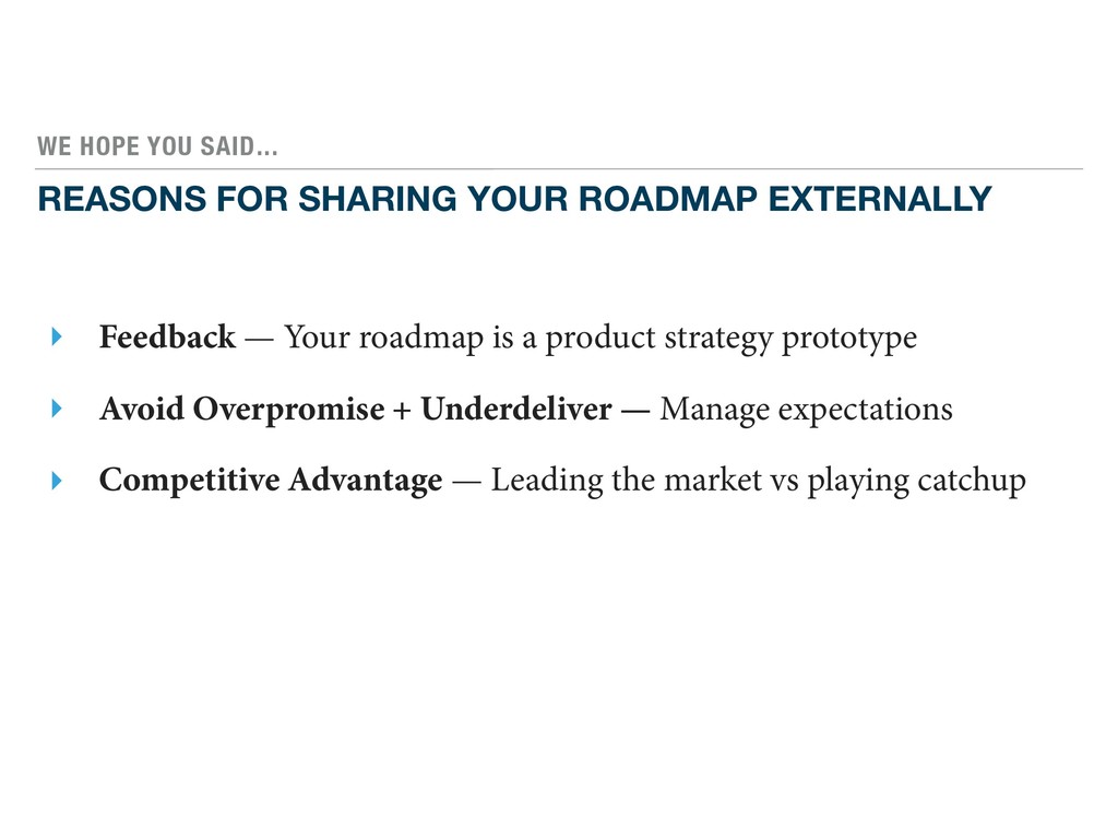 ‣ Feedback — Your roadmap is a product strategy prototype ‣ Avoid Overpromise + Underdeliver — Manage expectations ‣ Competitive Advantage — Leading the market vs playing catchup