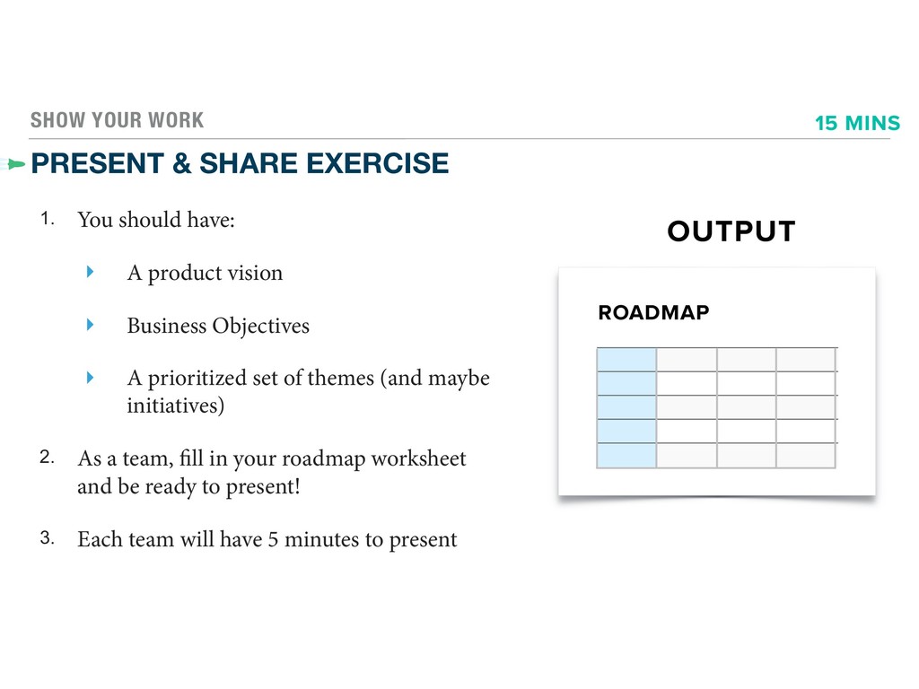 have: ‣ A product vision ‣ Business Objectives ‣ A prioritized set of themes (and maybe initiatives) 2. As a team, fill in your roadmap worksheet and be ready to present! 3. Each team will have 5 minutes to present OUTPUT 15 MINS ROADMAP