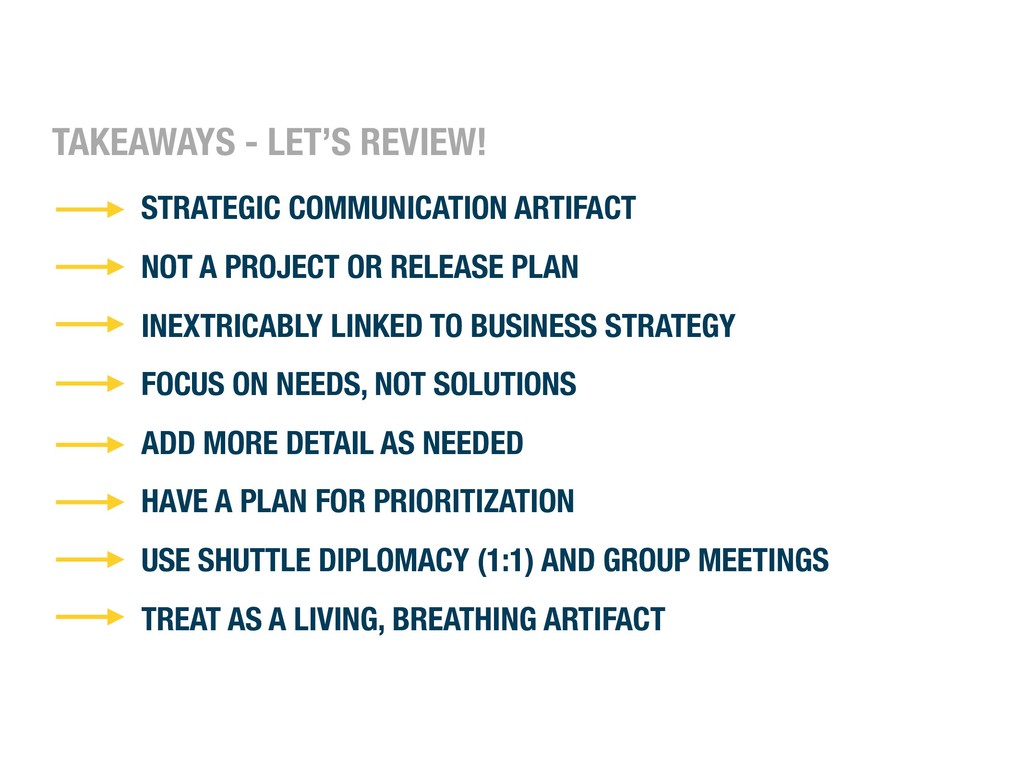 LINKED TO BUSINESS STRATEGY FOCUS ON NEEDS, NOT SOLUTIONS ADD MORE DETAIL AS NEEDED HAVE A PLAN FOR PRIORITIZATION USE SHUTTLE DIPLOMACY (1:1) AND GROUP MEETINGS TREAT AS A LIVING, BREATHING ARTIFACT TAKEAWAYS - LET’S REVIEW!